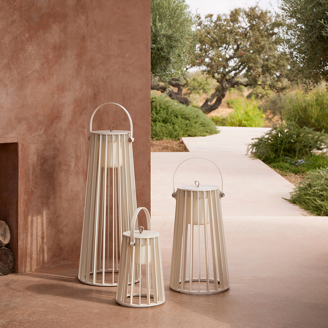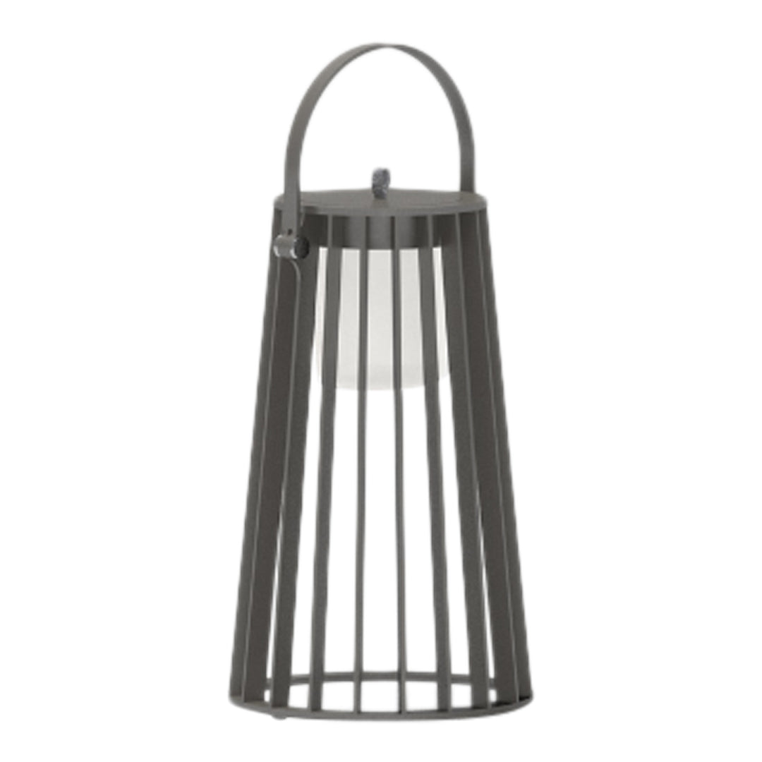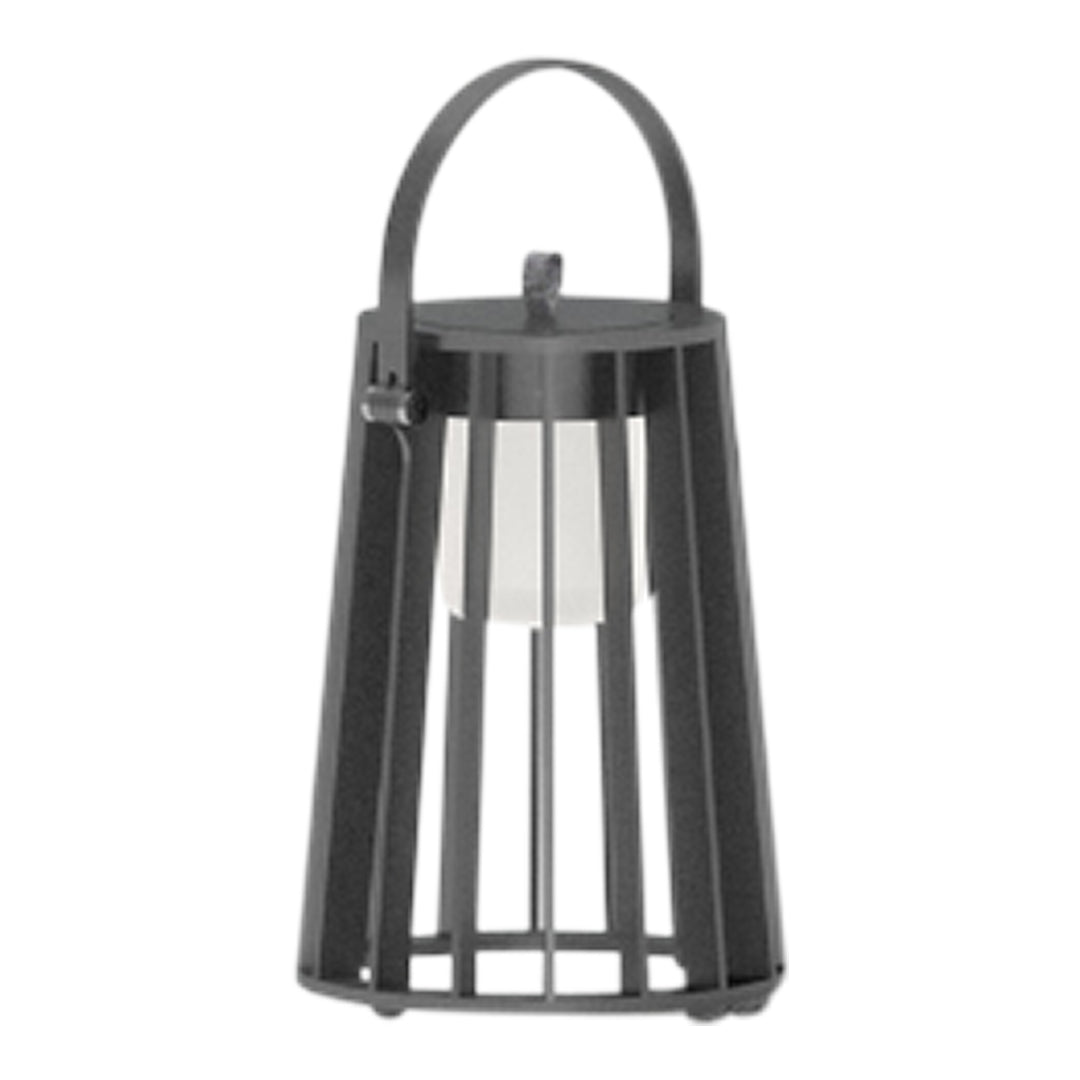 Portable, rechargeable floor lamp designed for outdoor use, combining simplicity and precision in a conical silhouette with an integrated handle. Made of aluminum with mineral white and anthracite gray finishes.