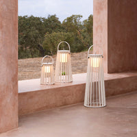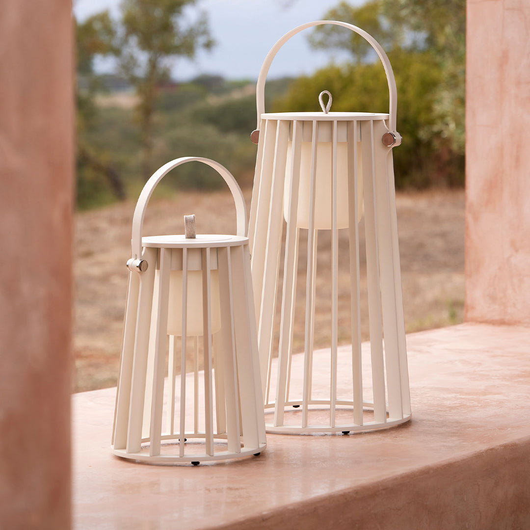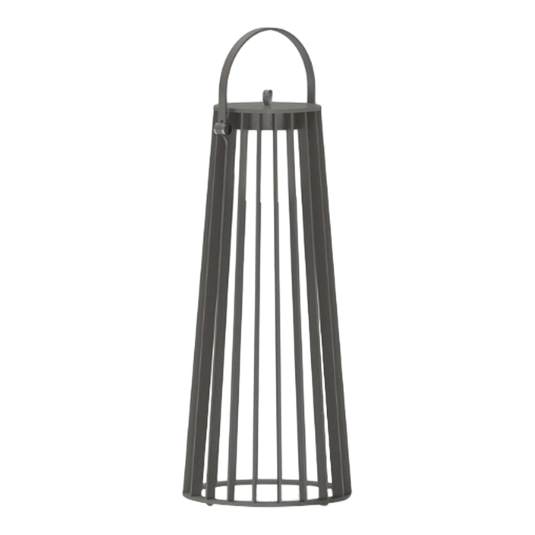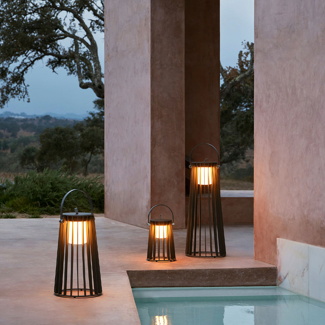 Portable, rechargeable floor lamp designed for outdoor use, combining simplicity and precision in a conical silhouette with an integrated handle. Made of aluminum with mineral white and anthracite gray finishes.