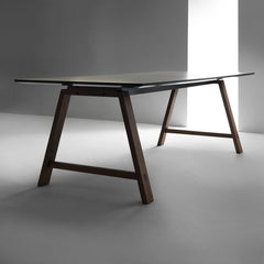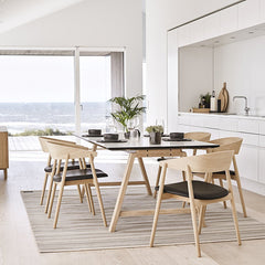 T1 is a table with character and lightness. A timeless style that blends with interiors in all modern homes. The tabletop is with hard-wearing high-pressure laminate and the legs are made of solid wood with elegant details such as visible dowelling. The table comes in two versions - with a fixed tabletop or as an extendable table.