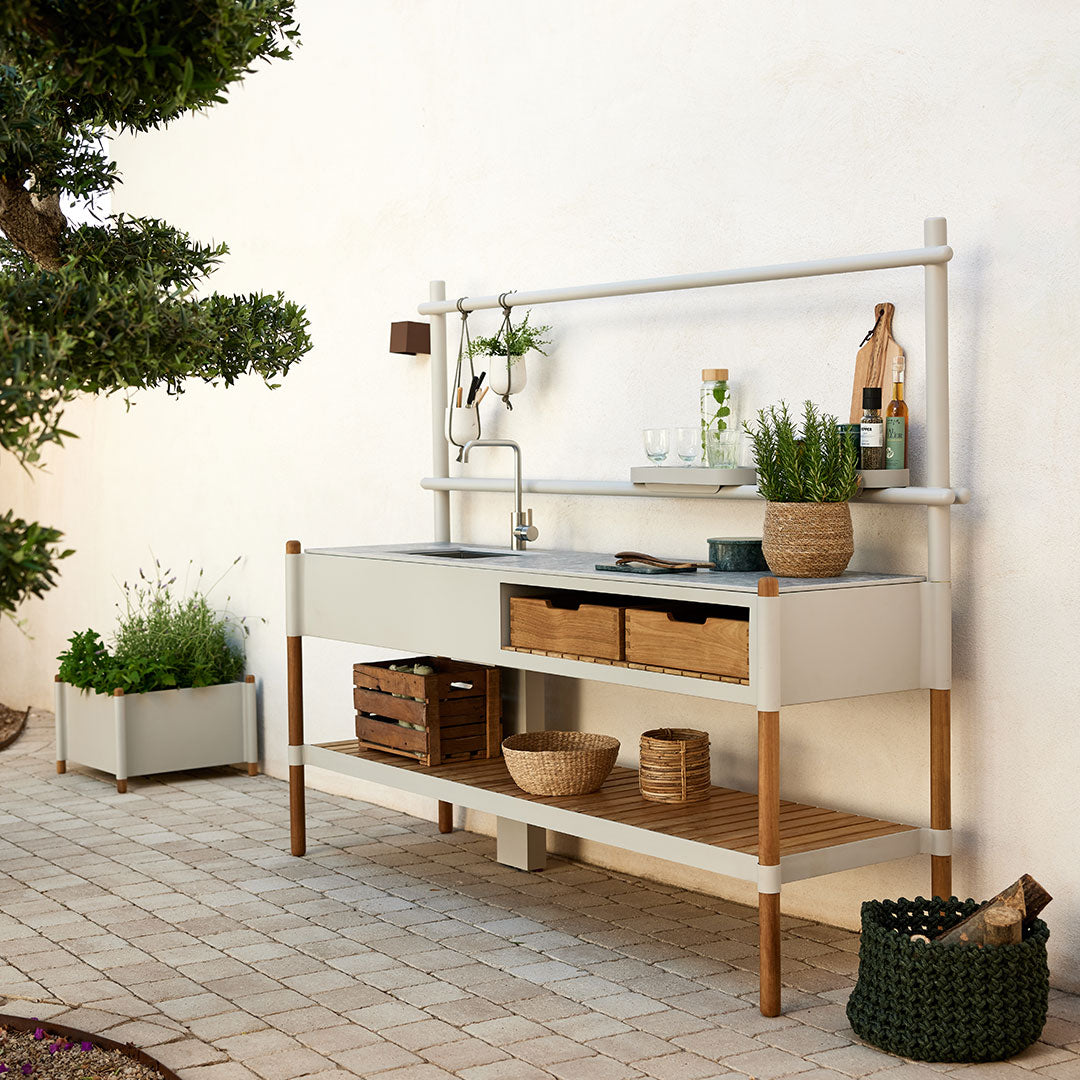 Sticks kitchen with Teak Shelf: where nature meets functionality. Experience the beauty and practicality of Sticks outdoor kitchen. Inspired by the elegance of sticks, this kitchen design combines natural charm with modern functionality. The teak shelves bring warmth and provide storage options. Featuring spacious countertop space and durable craftsmanship, it creates a captivating and organized culinary haven. Elevate your outdoor kitchen with the timeless beauty and functionality of the Sticks Kitchen.