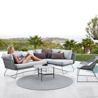 Horizon is an aesthetic and minimalistic lounge, with sharp lines and a modern expression. Horizon is a modular lounge concept based on a Scandinavian design, focusing on high comfort and flexibility. The lounge is modular and can therefore match any need, with the possibility of building your outdoor lounge area as large or small as your outdoor space allows. Horizon can stand alone as a single module, or be combined into a large corner or U-sofa. The narrow steel frame gives the lounge a slightly floating expression, which together with the woven seat forms an elegant frame on the lounge. Seat and cushions are made from the soft and comfortable Cane-line Nattà © fabric, which makes Horizon the perfect place for relaxation and reflection.