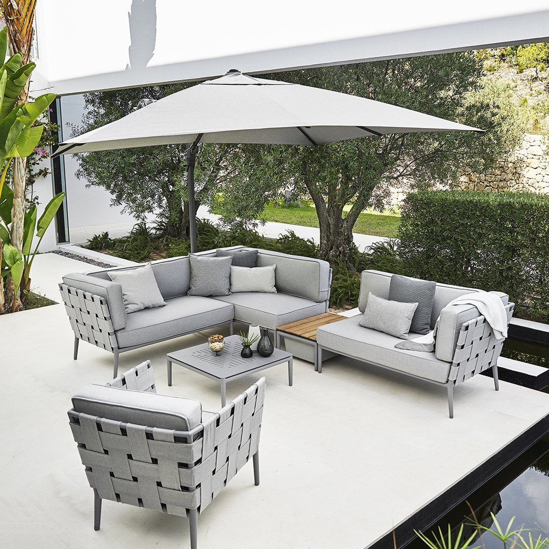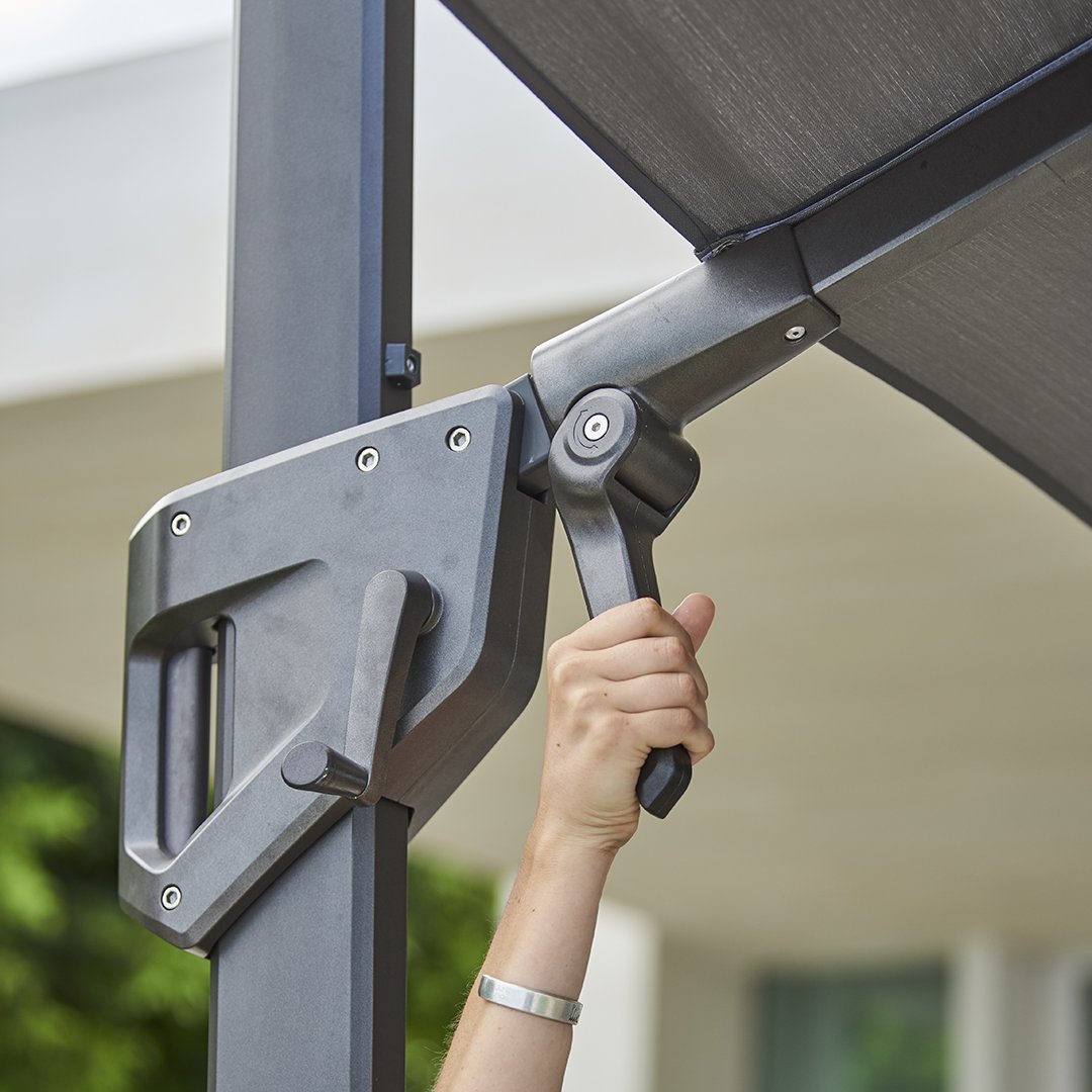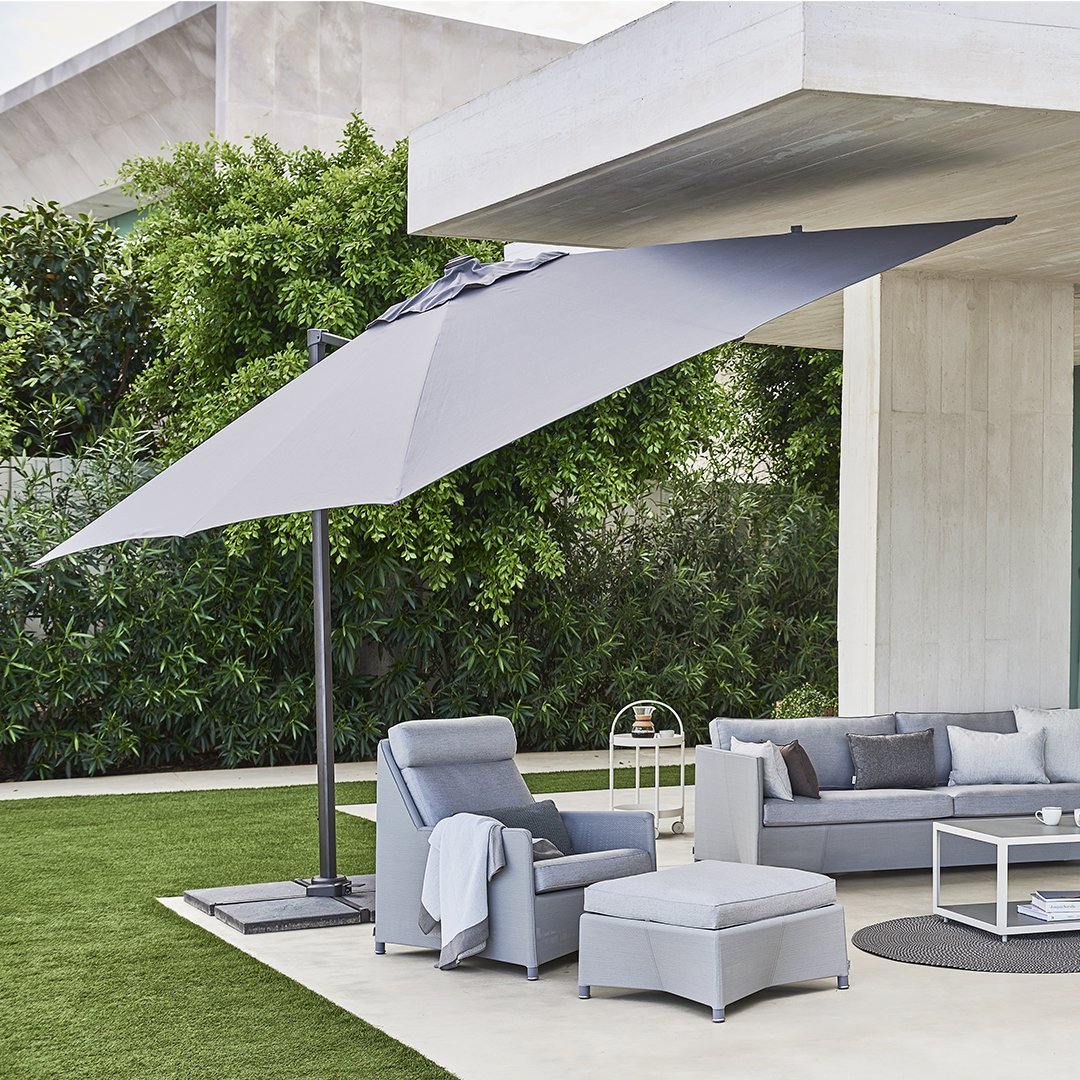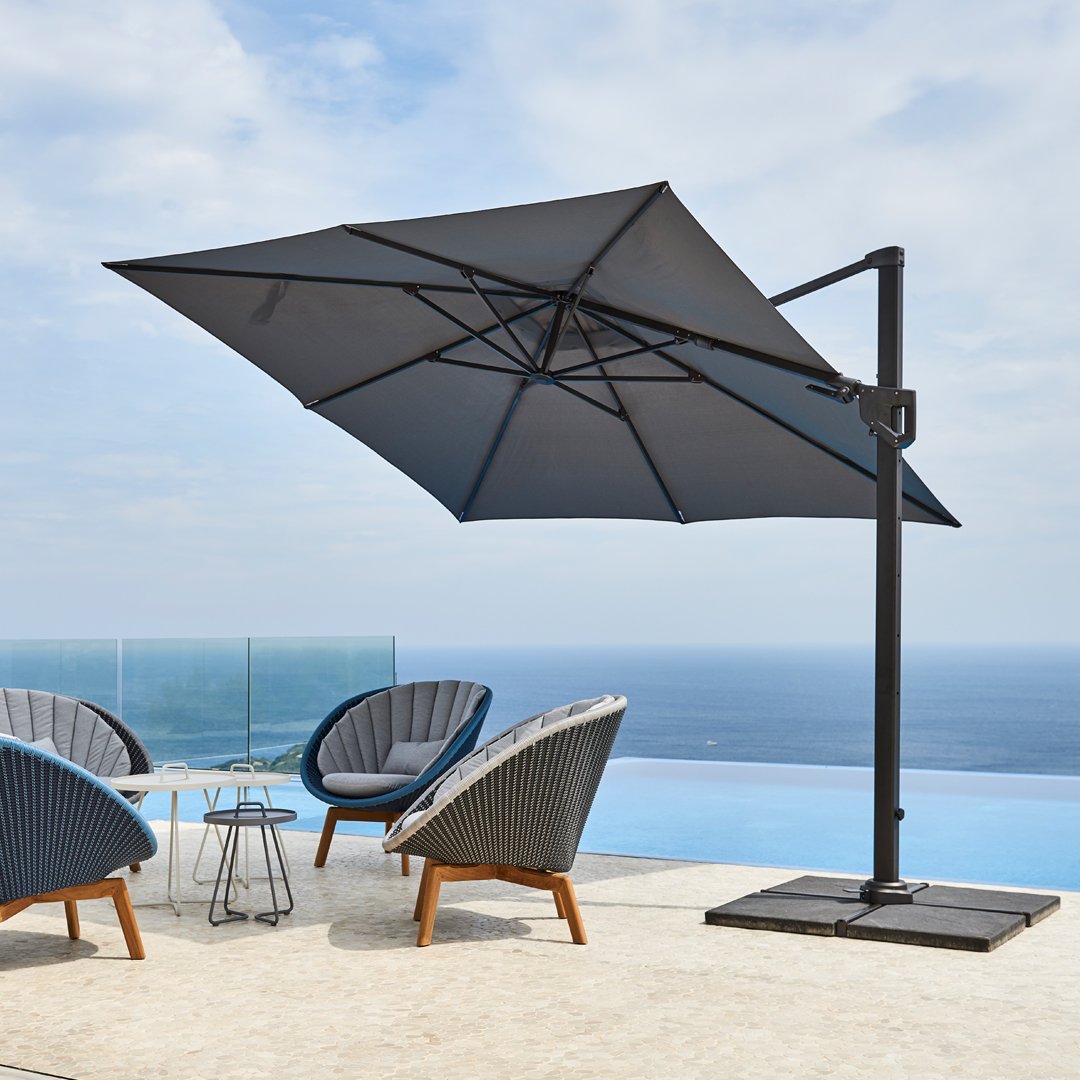 The Hyde parasol is a modern and timeless design that fits on most terraces. Hyde hanging luxe parasol is made of aluminium and comes in different fabric colour choices. The Hyde parasol can rotate, which makes it easy for you to catch the sun. The Hyde parasol is sold including 4 x 25 kg stone tiles to hold it in place. We advise that the parasol is not used during heavy wind. Fabric is made of 100% solution dyed polyester 280g/m2.
