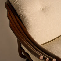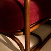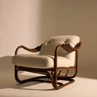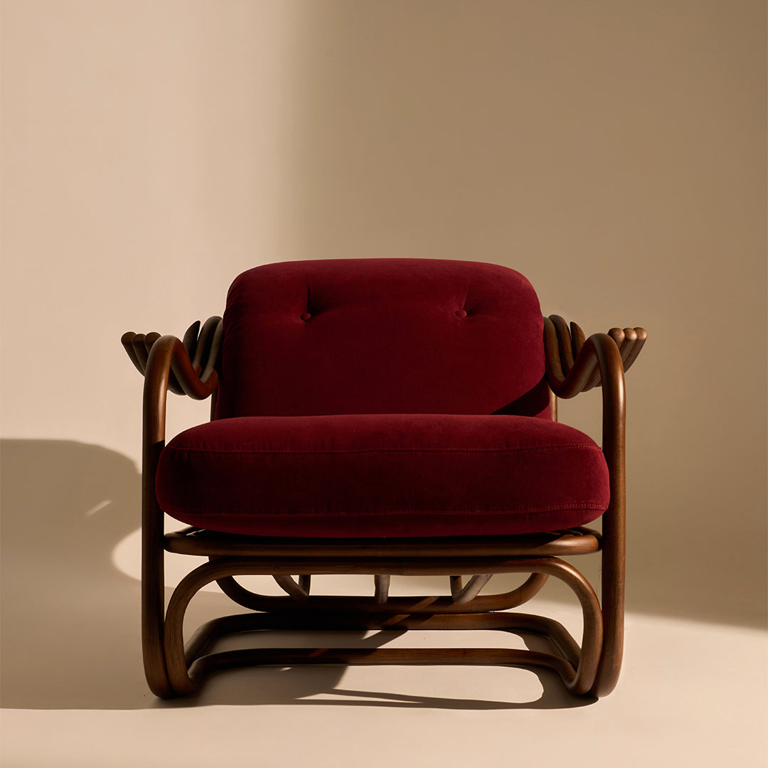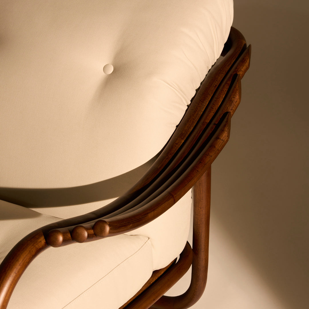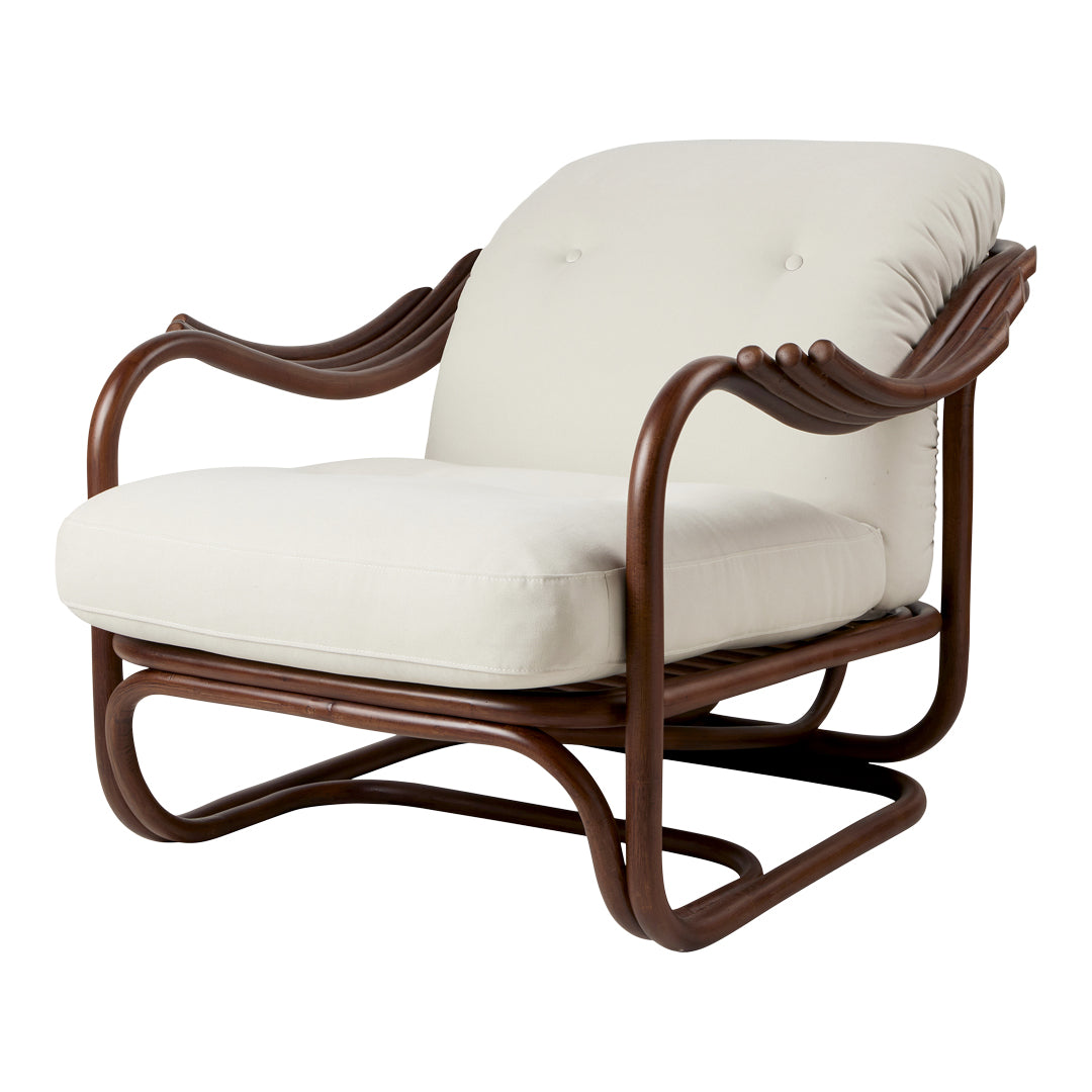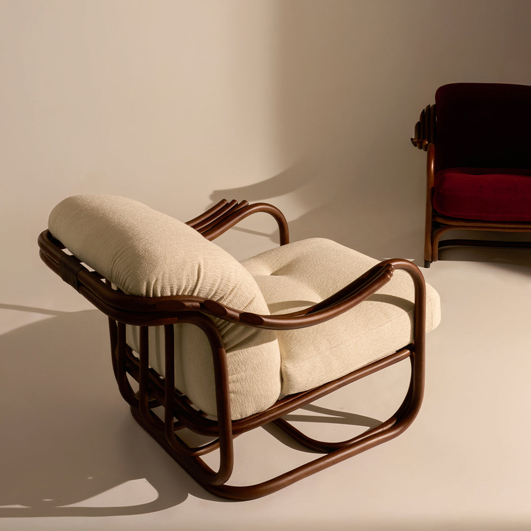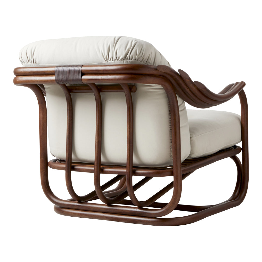 Seamlessly merging the inherent beauty and charm of natural rattan with meticulous ergonomic precision, the Poltrona Tria Lounge Chair embodies both artistry and function. Constructed almost solely from steam-bent rattan canes, curved and fixed into place by hand, it features a distinctive set of gracefully contoured armrests, creating a visually striking yet supremely comfortable seat. Enhanced by two deep-set cushions, the Poltrona Tria delivers an exceptional lounging experience in any indoor setting – while the natural material expressions bring a welcome touch of the outdoors into the home.