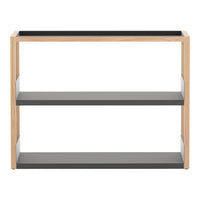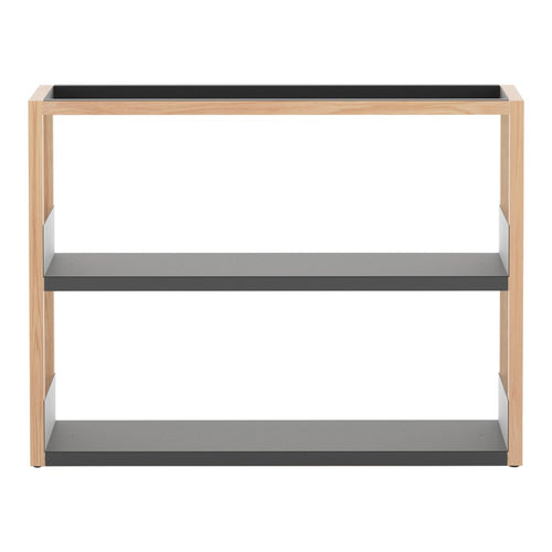 Flexible shelving system, available in three heights with a variety of component configurations. The width can be increased by adding extension units and more metal components.