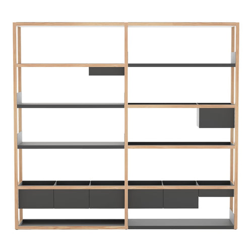 Flexible shelving system, available in three heights with a variety of component configurations. The width can be increased by adding extension units and more metal components.