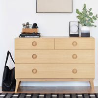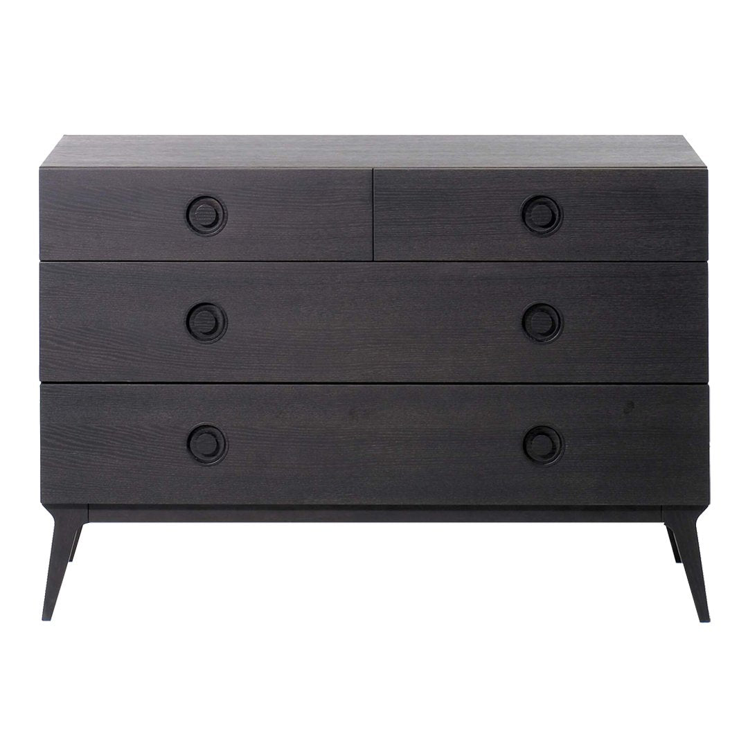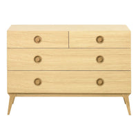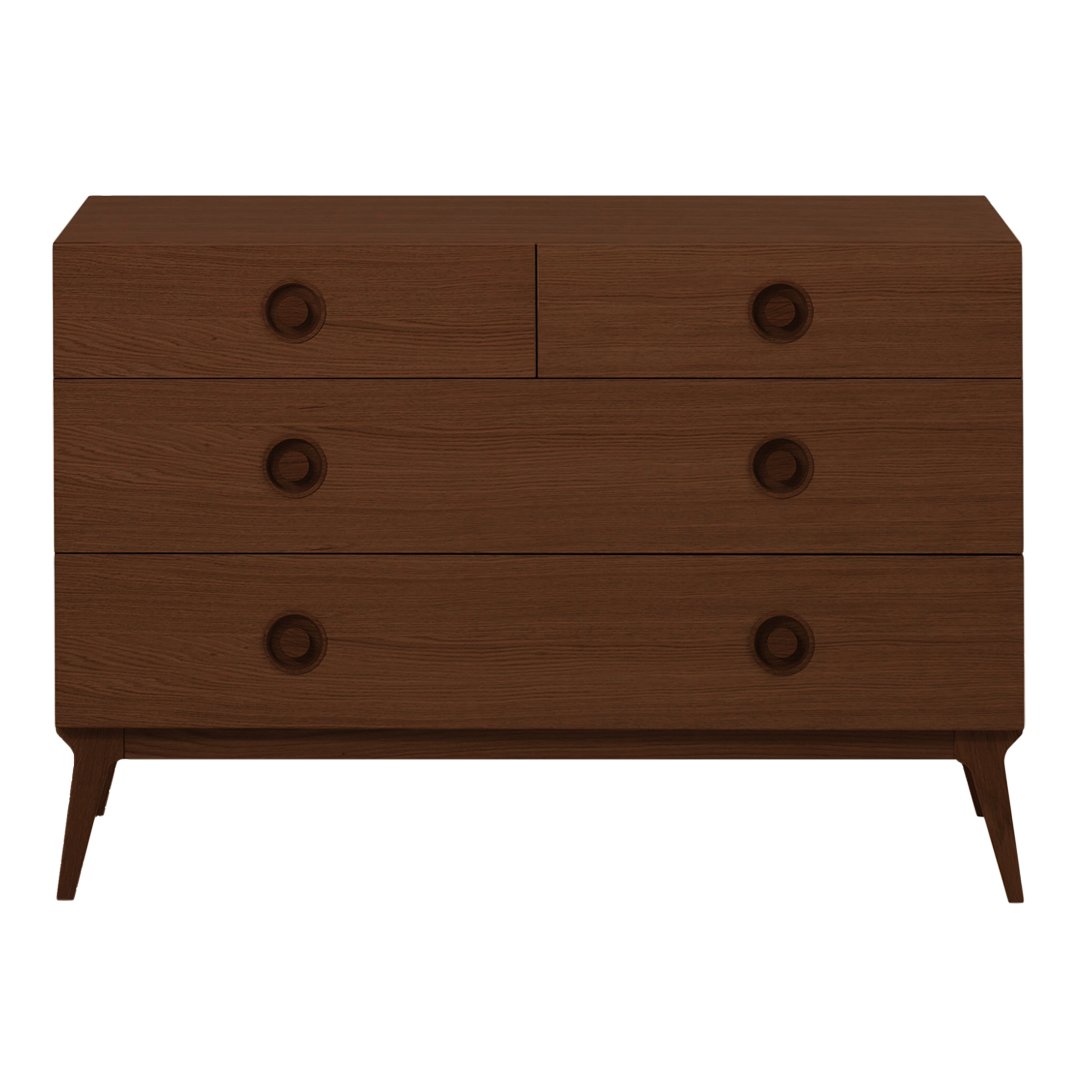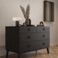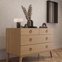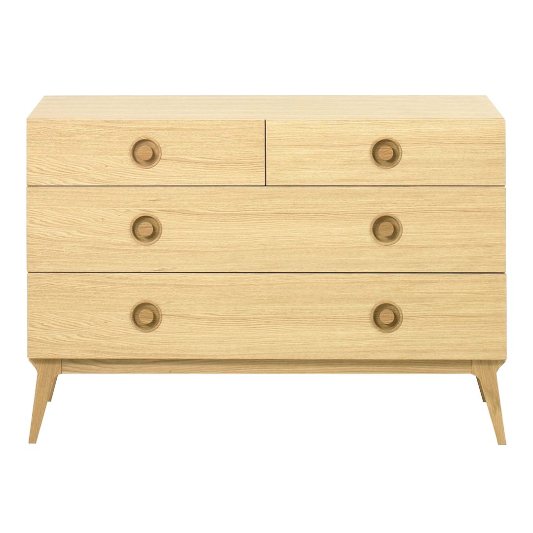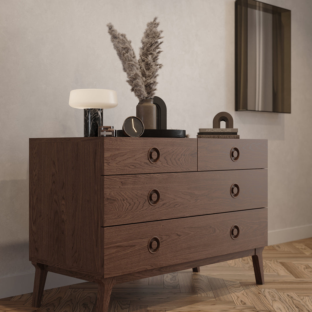 Made with a solid natural oak, walnut or black stained base and body, it has self-closing drawers and inset-turned solid wood handles which keep the handles flush against the front of the drawers saving space in smaller rooms.