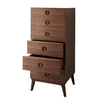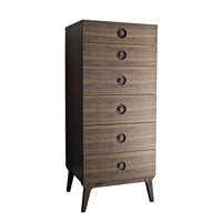 Made with a solid natural oak, walnut or black stained base and body, it has self-closing drawers and inset-turned solid wood handles which keep the handles flush against the front of the drawers saving space in smaller rooms..