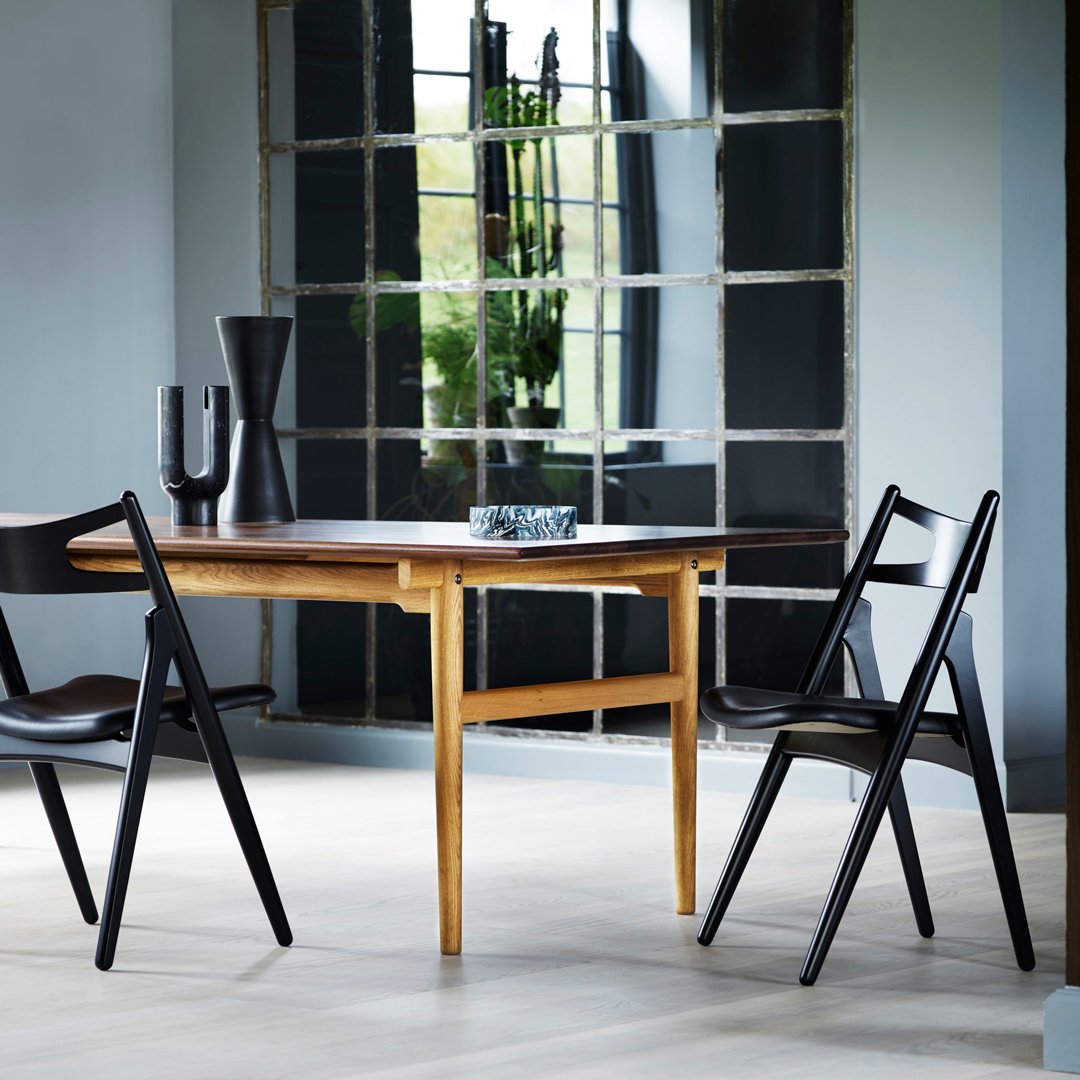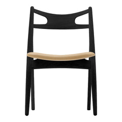 This version of the Wegner CH29 Chair features a beech frame in 13 colors. The Wegner CH29 chair was designed in 1952. The cutting out in the sides of the back, the pointed legs and the elaborate execution of the joint between forelegs and hind legs are details making the sawhorse chair a distinctive and sculptural piece of furniture. Wegner's construction of the CH29 has resulted in a chair as sturdy as any traditional chair but with the use of fewer parts. The heavily curved back and wide seat front makes it a very comfortable chair.