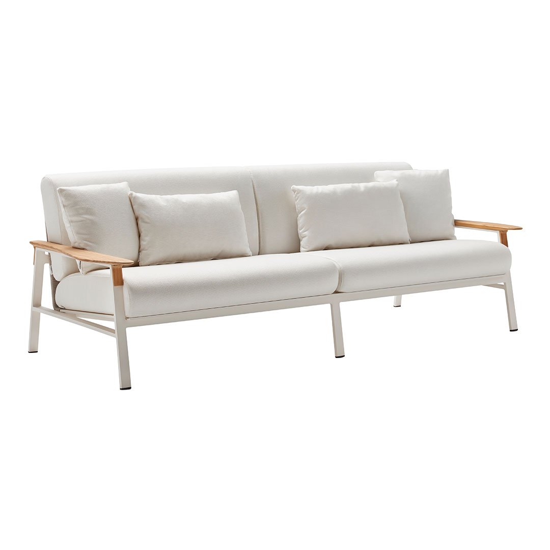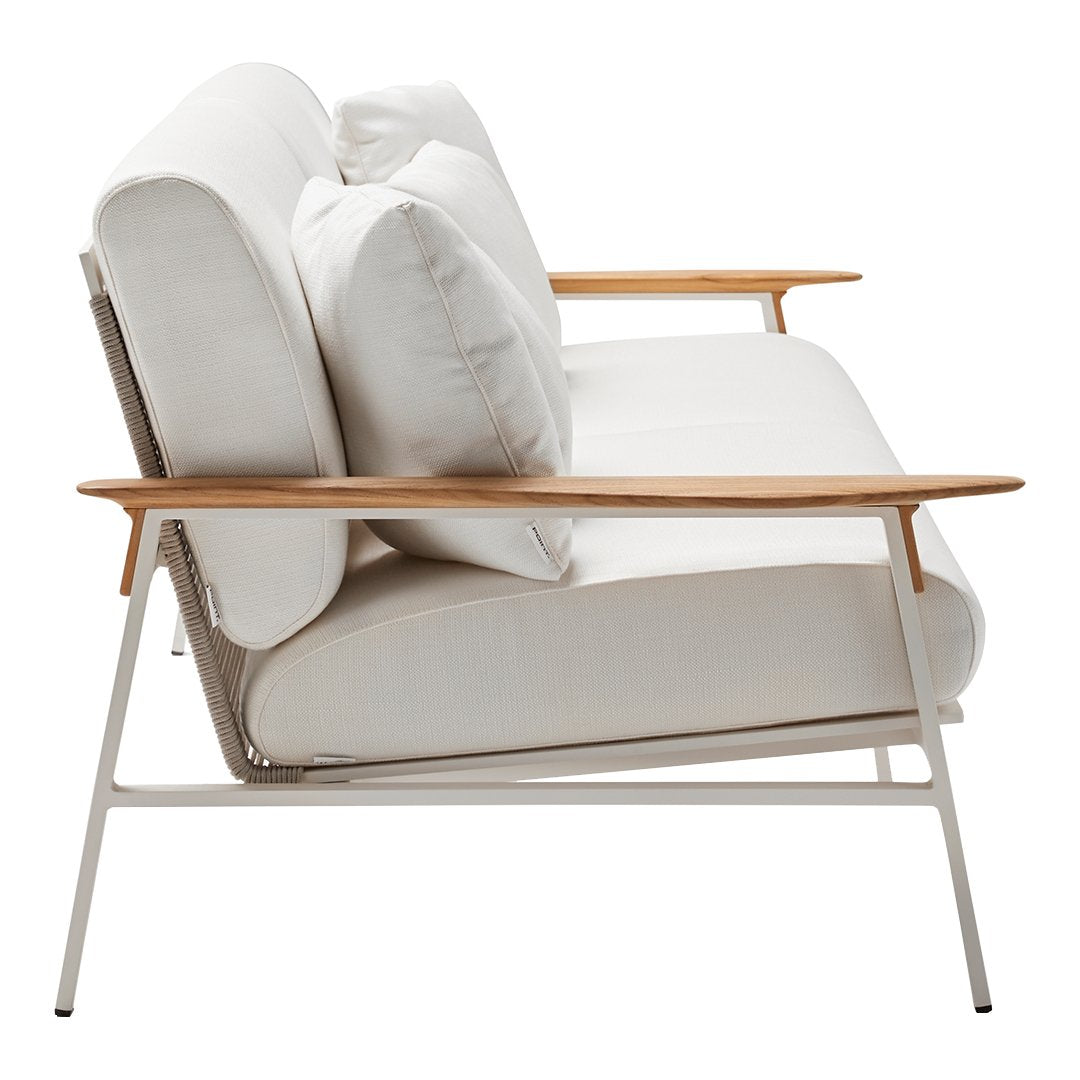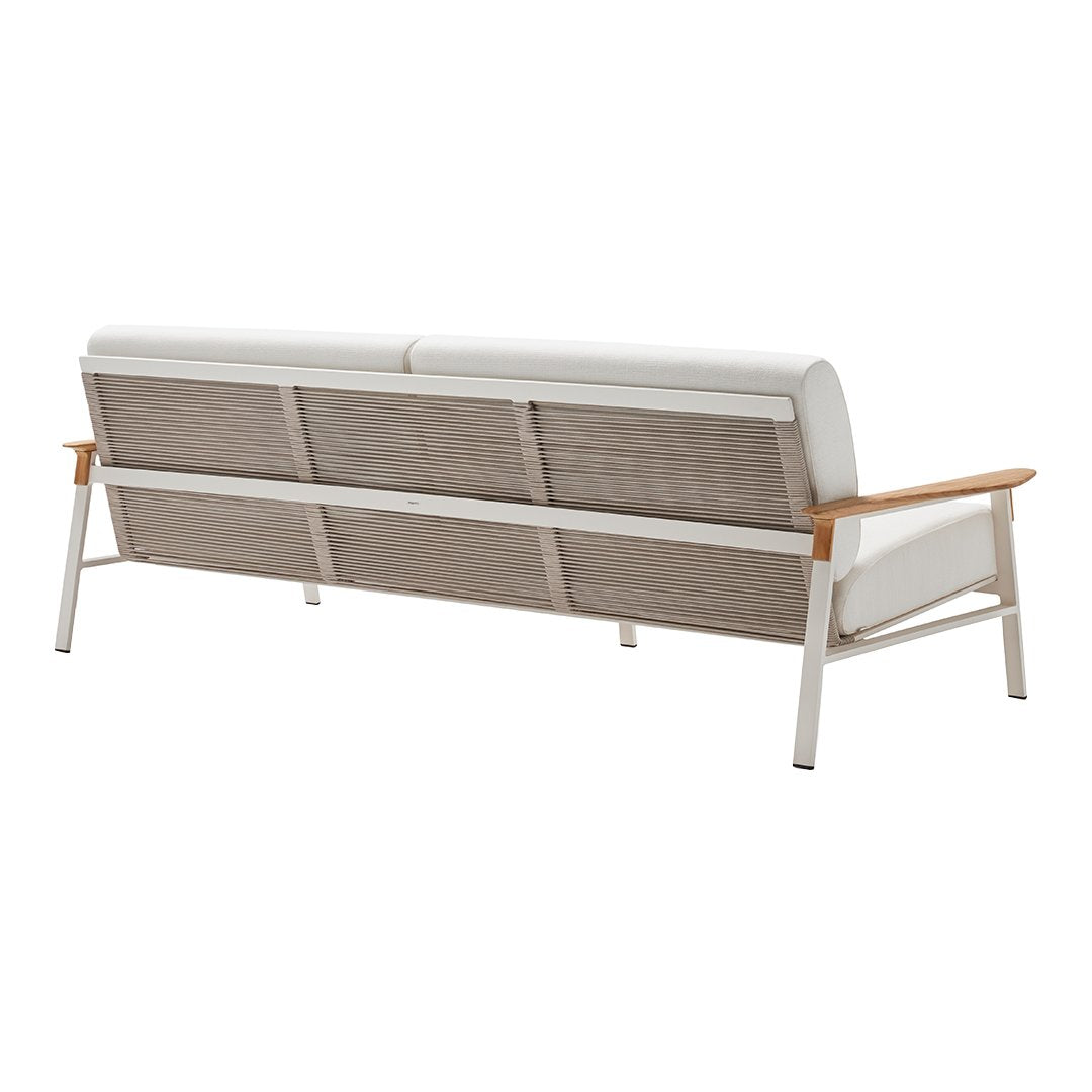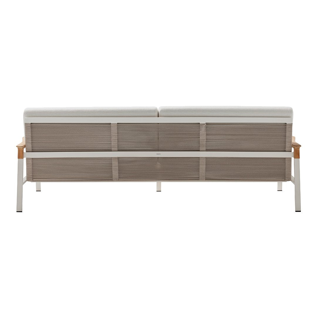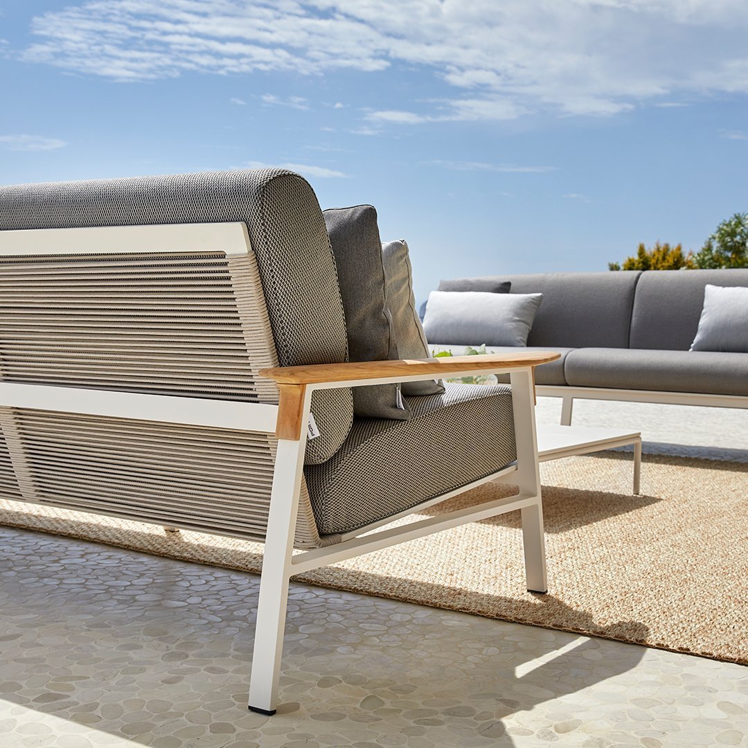 3 seater sofa with powder-coated Aluminum frame and teak arms. Woven back in 4mm polyester rope. Three finishes: Cream Aluminum 34 with Beige rope, Sand Aluminum 74 with Pearl Grey rope or Metallic Grey Aluminum 56 with Graphite rope. Seat and back cushion in high resistance 35 kg polyurethane foam.The seat cushions include the GOODSIDE slatted suspension method, which is combined with foam to make the seat highly resistant and comfortable. The cushions with this system always include a waterproof cover.