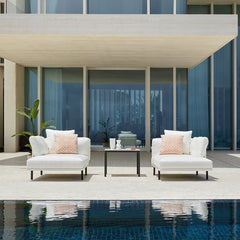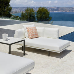 Chaise lounge with powder-coated Aluminum frame and adjustable legs. Aluminum finish in one color: Metallic grey 56. Seat and back cushion in high resistance 35 kg polyurethane foam. The seat cushions include the GOODSIDE slatted suspension method, which is combined with foam to make the seat highly resistant and comfortable. The cushions with this system always include a waterproof cover.