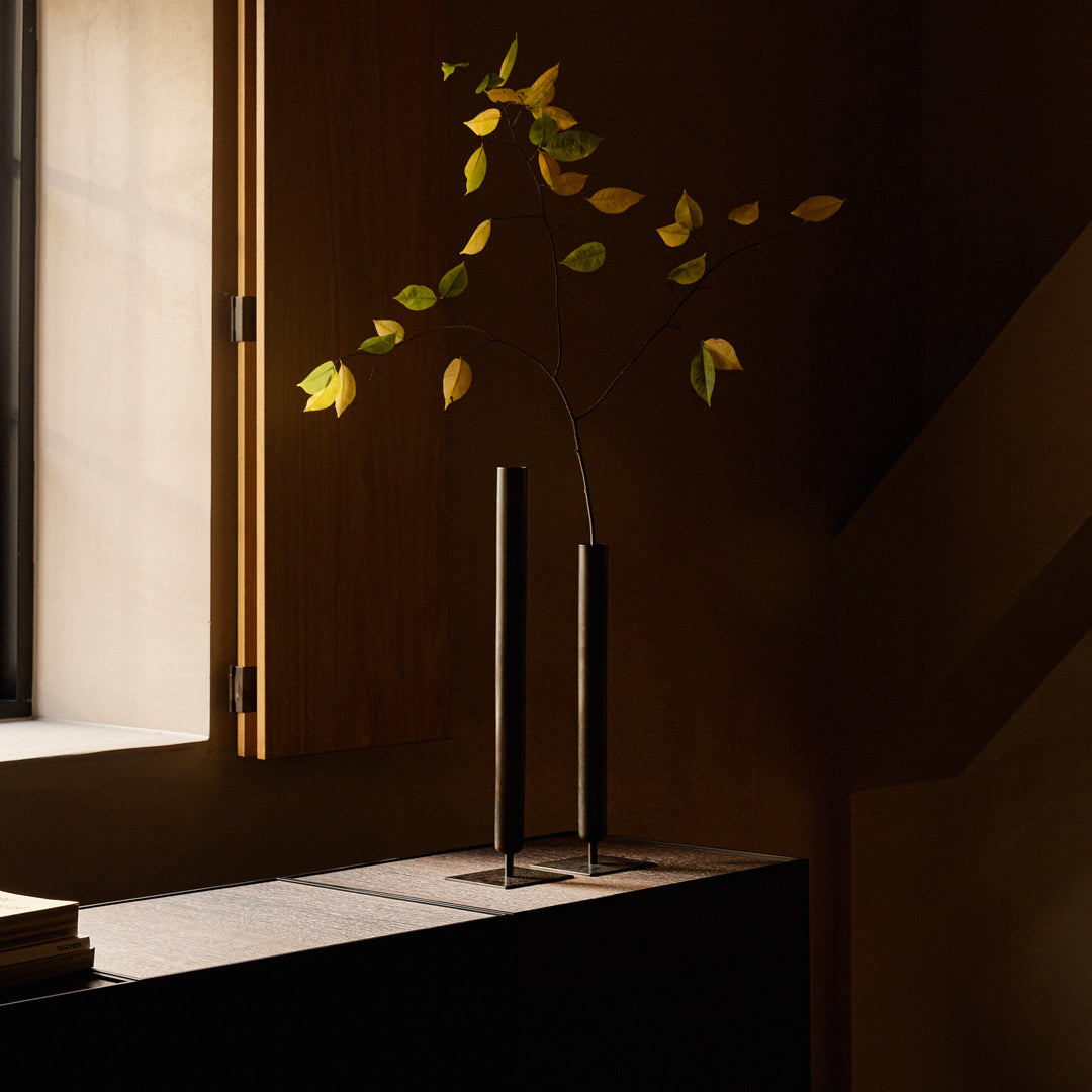 Simple. Sophisticated. Sculptural. The Stance Vase is inspired by traditional display stands to provide support for branches or long-stemmed flowers. The bronzed brass vase patinates beautifully over time and the understated design lends itself to any setting. Available in two sizes.