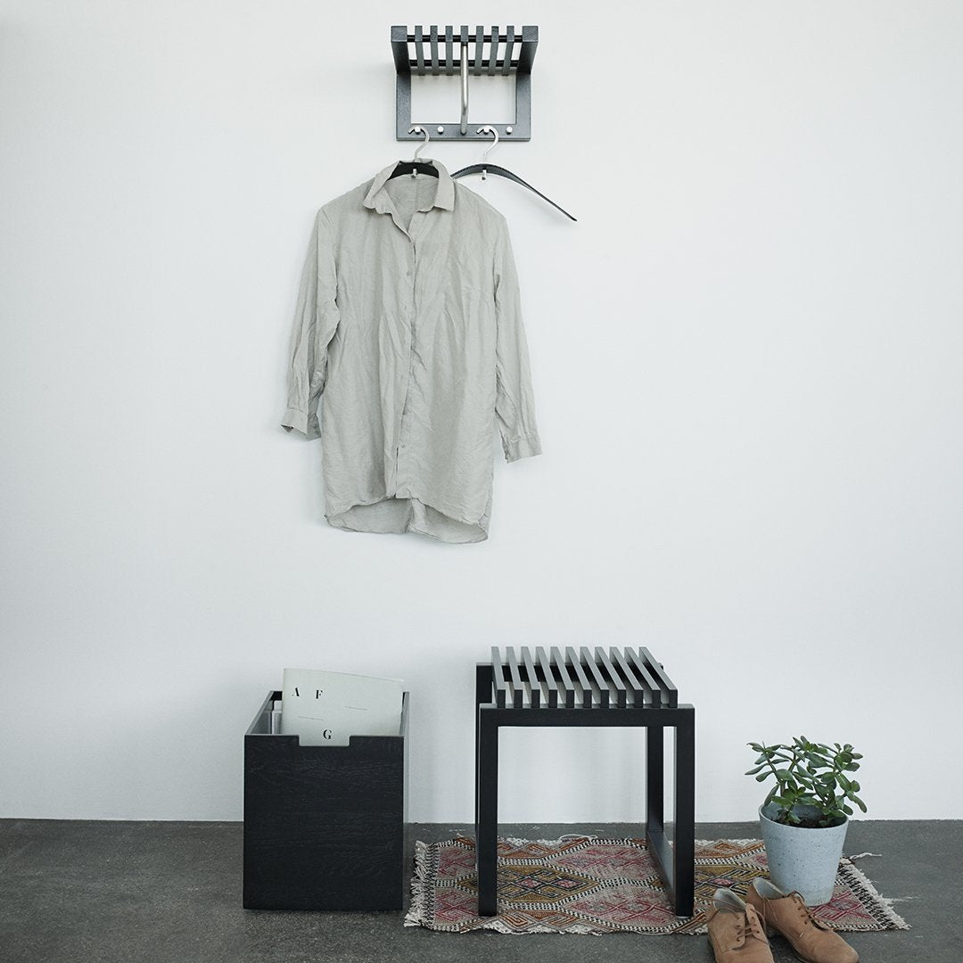 The Cutter Mini-Wardrobe is a very stylistically pure collection of shelves that, despite its modest size, incorporates a hanger rail, four hooks and a hat shelf. A practical little Cutter Box for gloves and caps can be placed on the shelf.