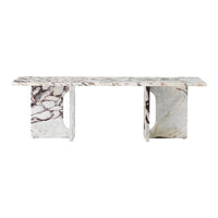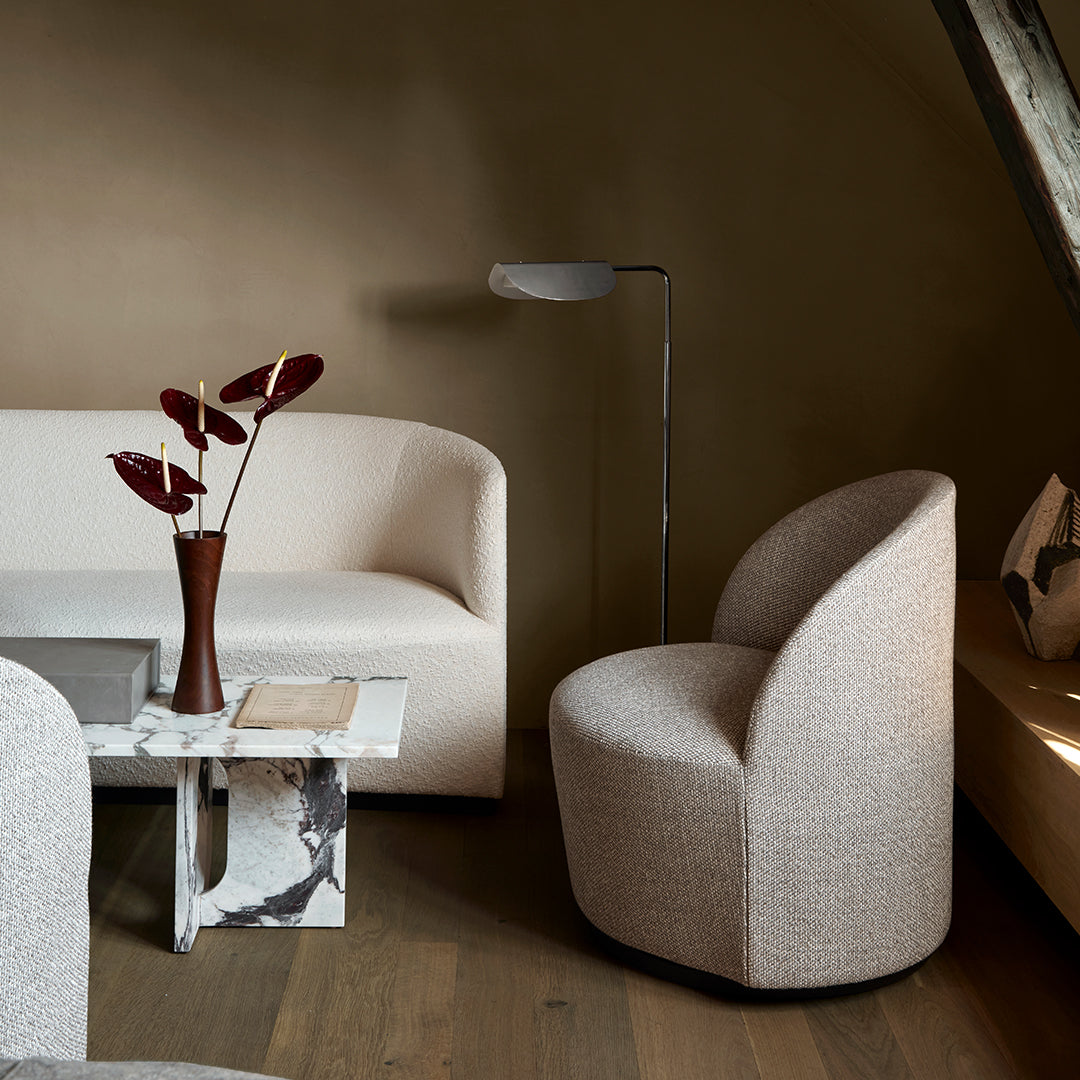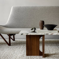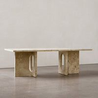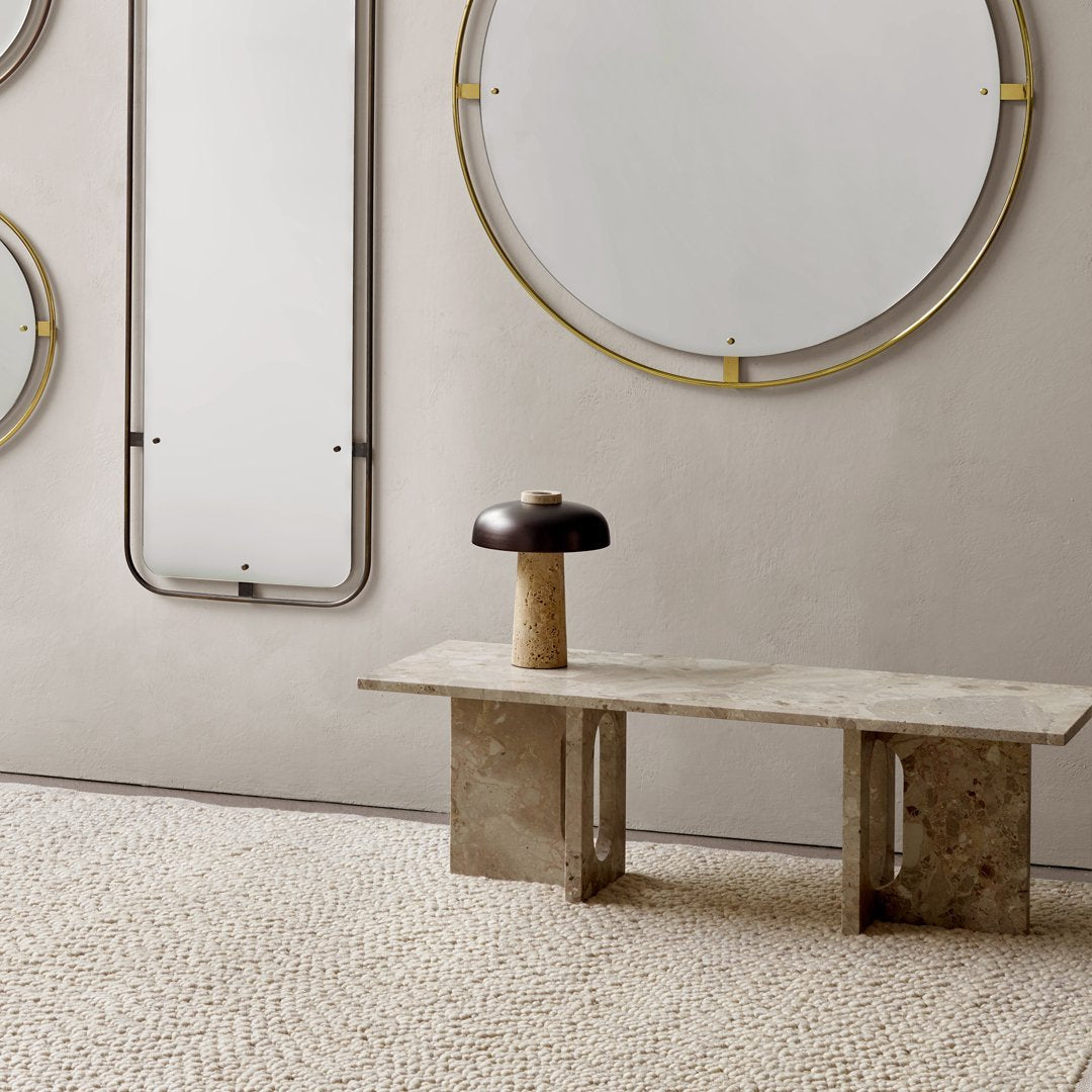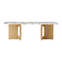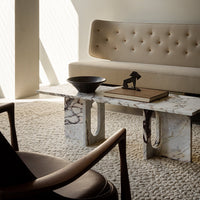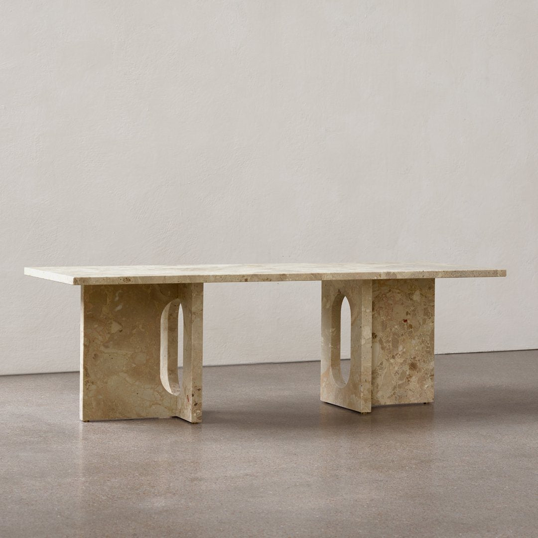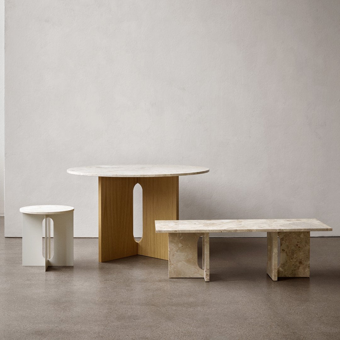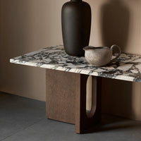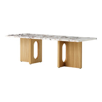 MENU's Androgyne Collection is distinguished by its playful, yet elegant silhouette and considered combination of natural materials. The invention of the Copenhagen-based Norwegian architect and designer Danielle Siggerud, its blend of the masculine and feminine, true androgyny, is what lends the collection its name. Like a magnificent monument, the new Androgyne Dining Table pairs oak and stone to striking effect. The bold and confident take on a dining table amplifies the silhouette of the collection's popular side table to grander proportions thanks to an elegant oak base, available in natural or dark stained, and a table top in corresponding wood or kunis breccia, an artistic blend of stones in warm tones that create subtle texture and add a new dimension to the design. A table not for the faint of heart, it makes a characterful accent in any space, from a domestic dining room to a modern restaurant or office gathering point, and serves multiple functions to bring a timeless quality to the design.