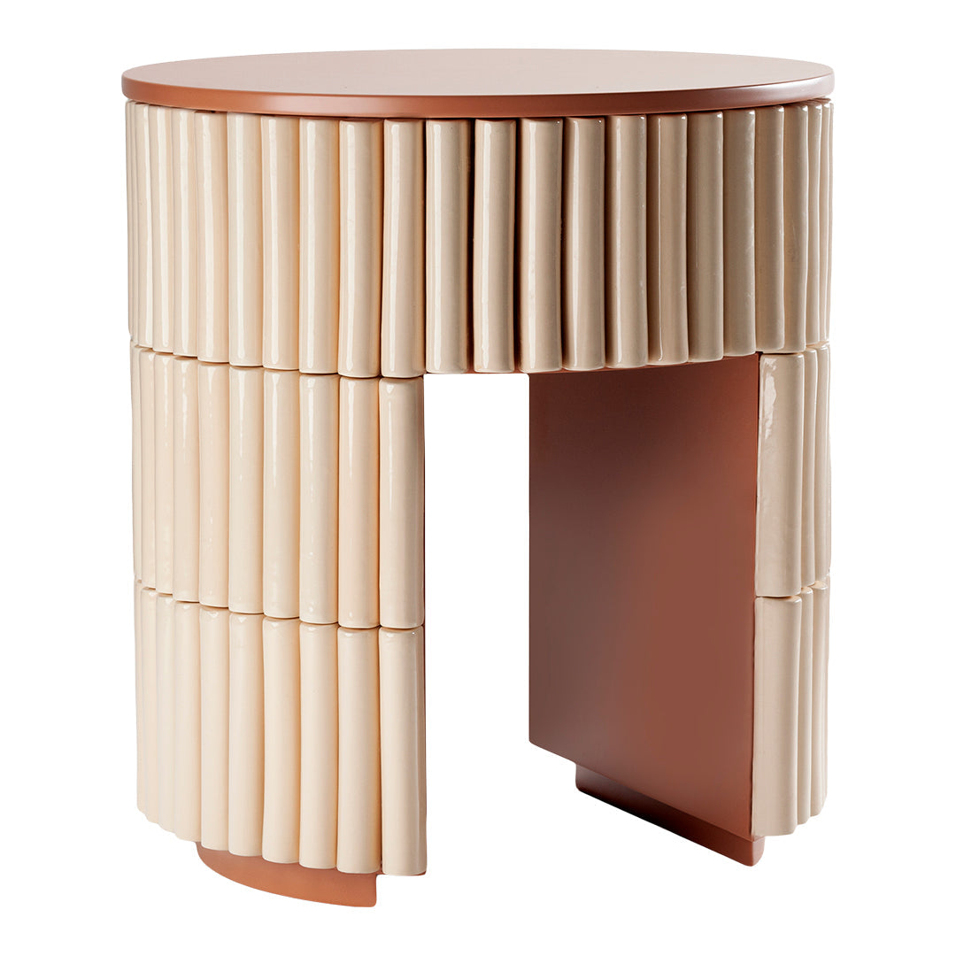 Exceptional in its craftwork, Nouvelle Vague is a side table that rejects traditional conventions in favor of experimentation. Round ceramic handmade pieces, painted in a unique craquele glaze are placed around a lacquered center top, creating a sense of movement that evokes the motion of the waves.