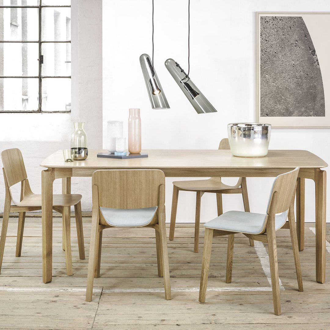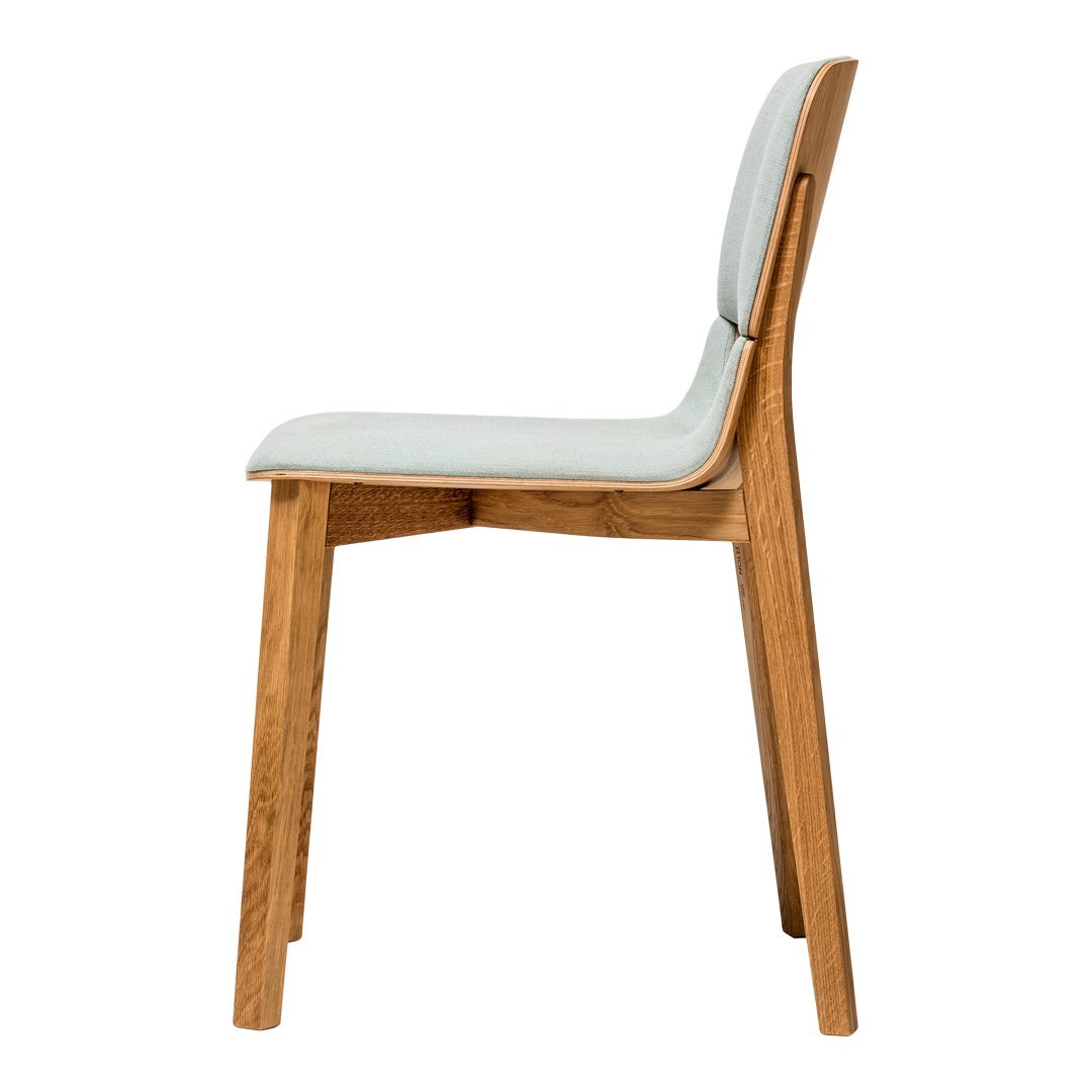 The seat and backrest from molded plywood suggest a model of optical and physical lightness. Its stability and strength are guaranteed by the construction made of bent solid wood. Apart from the veneer seat made of beech or oak, an upholstered version is also available.