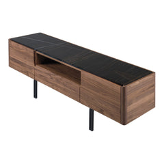 The interior has two compartments, providing enough space for multimedia devices. There is a hole in the back that allows the passage of cables.