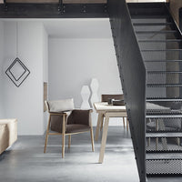 At 24 inches wide, 20.5 inches deep, and 32.7 inches high, with a comfortable 18.3-inch seat height, the Embrace Chair strikes an ideal balance between dining comfort and spatial efficiency. The frame, available in premium solid oak or walnut with various finishes, features continuous wooden elements where the legs integrate seamlessly into the overall silhouette rather than appearing as mere appendages.