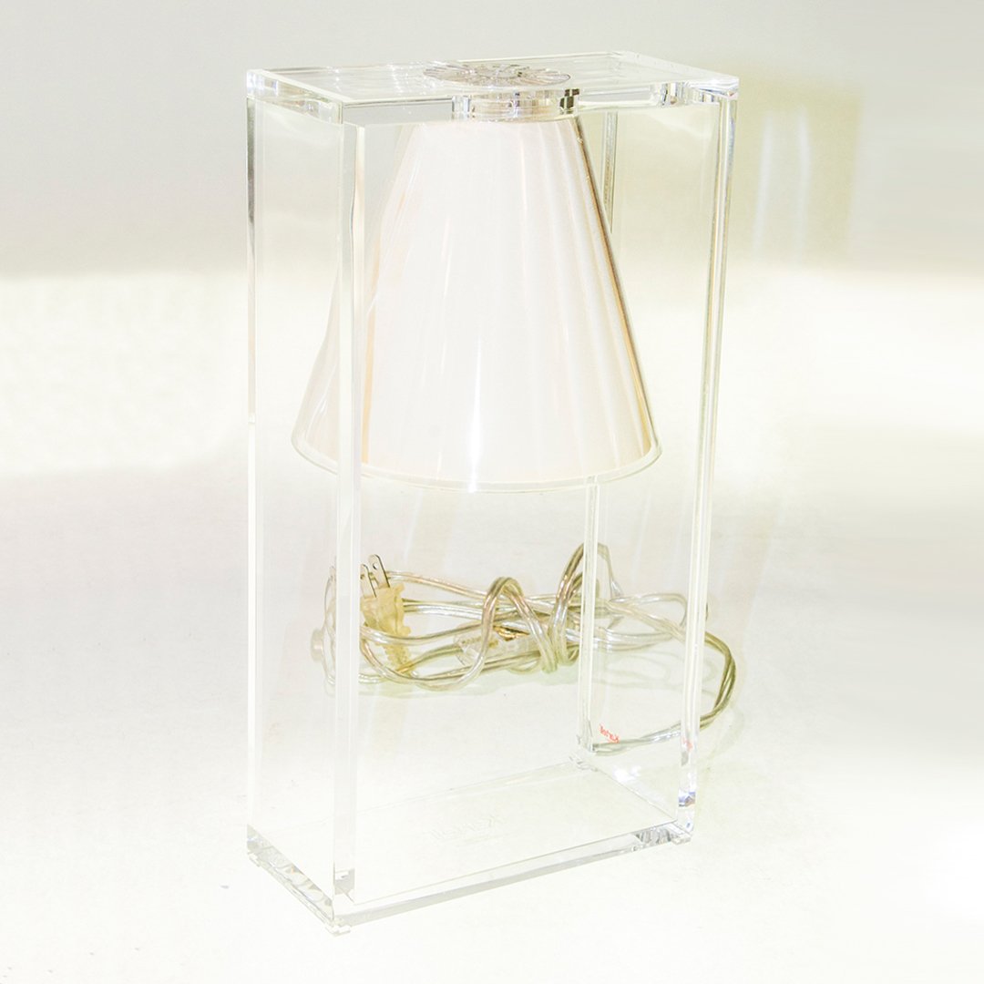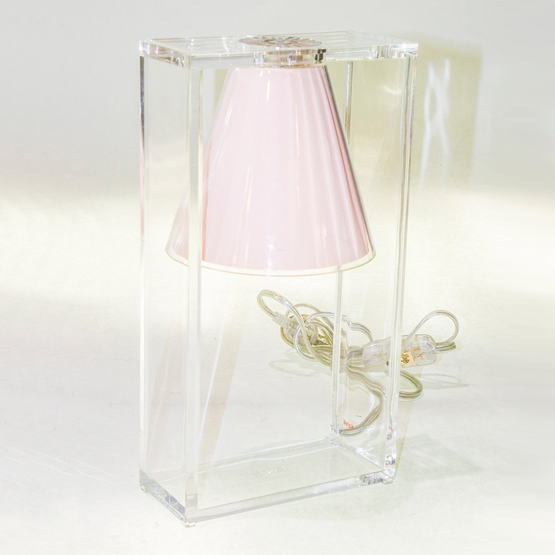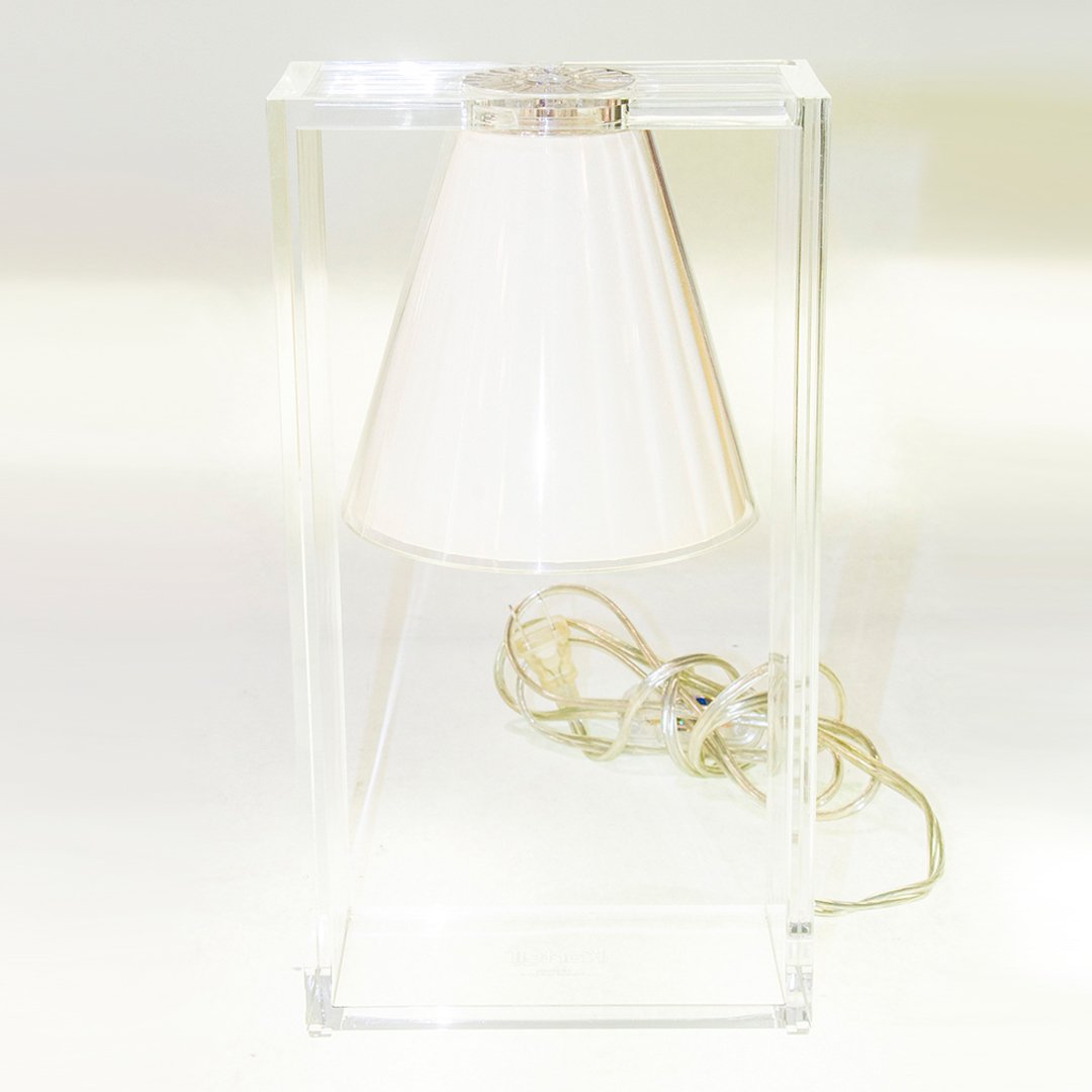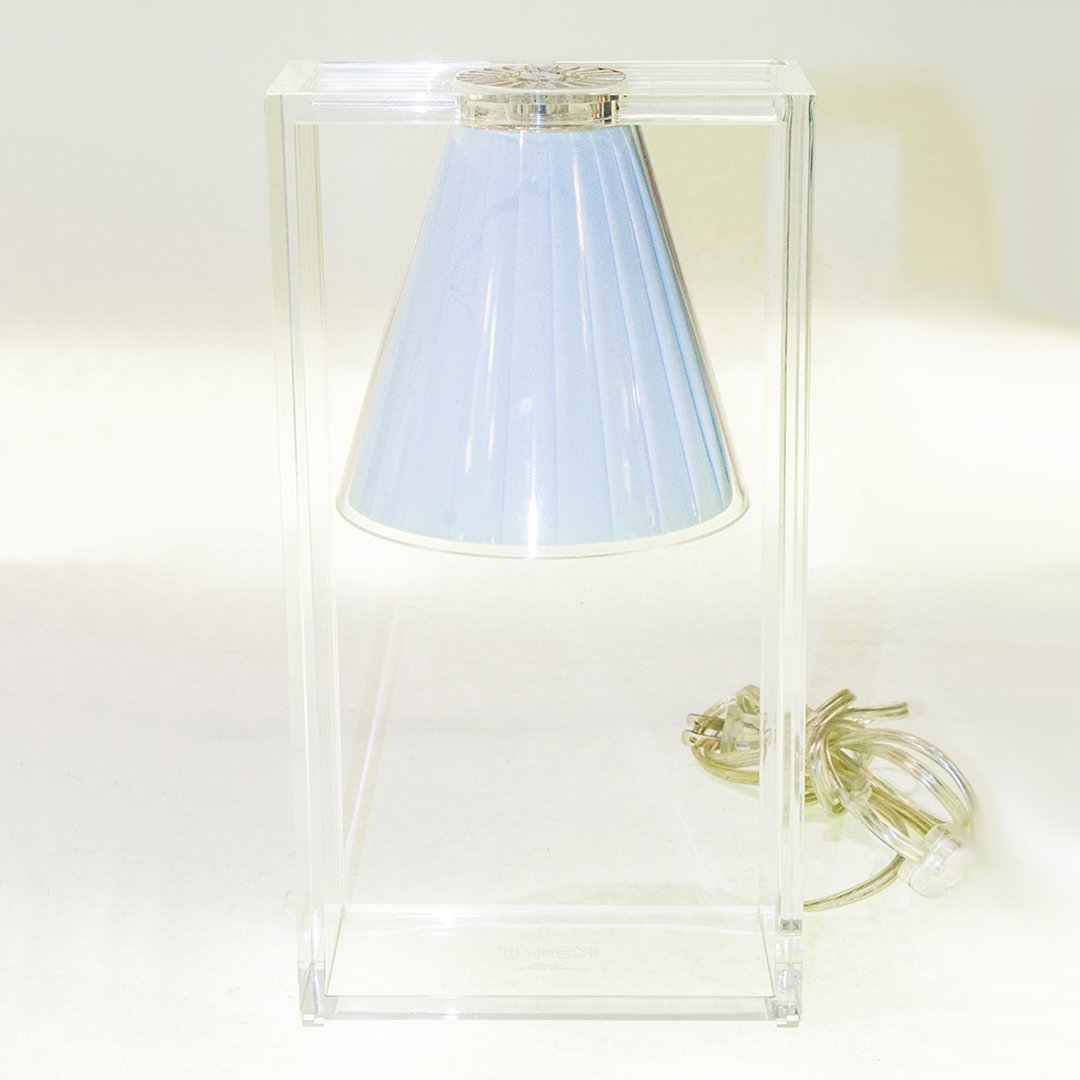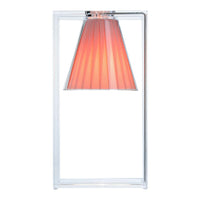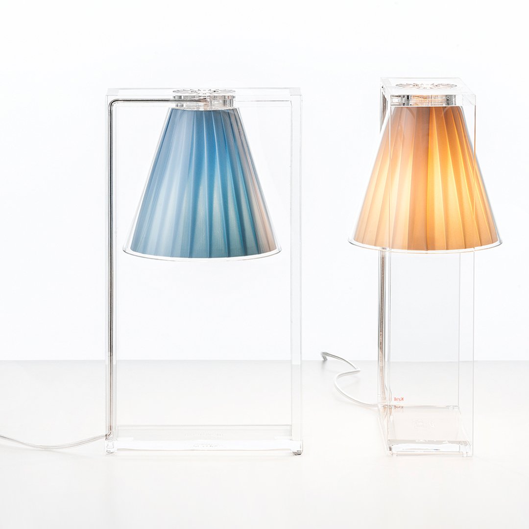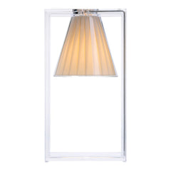 Light Air was created as an illusionist table lamp, a hanging light that defies the laws of gravity. Its structure is a strong graphic statement composed of a rectangular frame formed by two pieces of transparent thermoplastic technopolymer containing a pleated fabric conical shade.