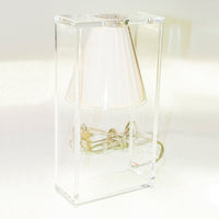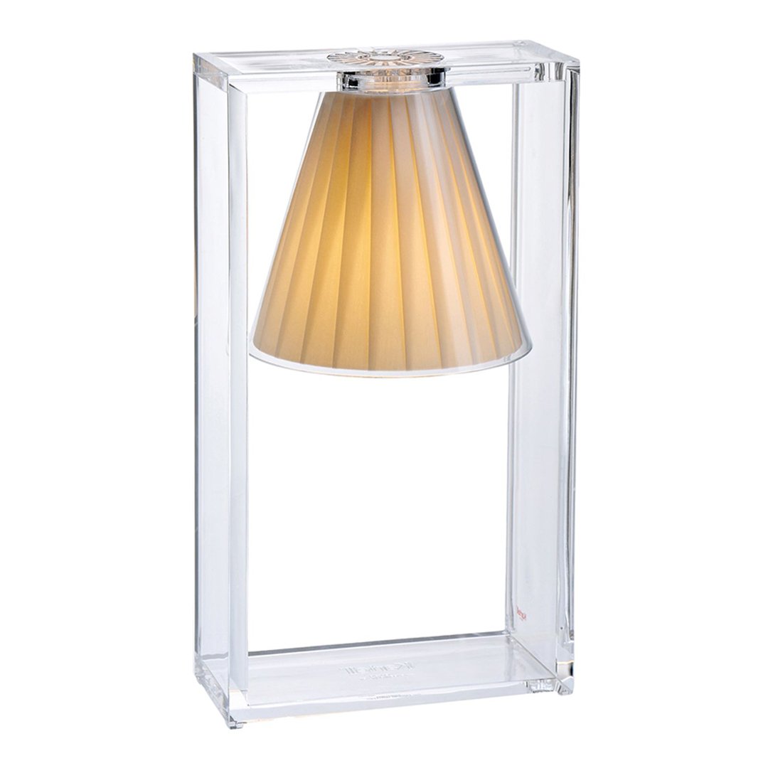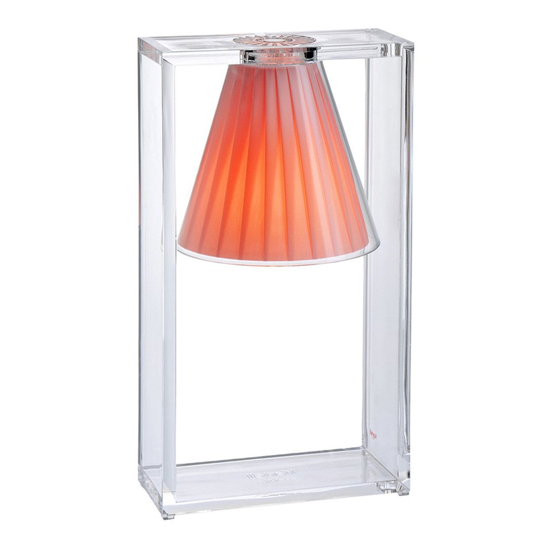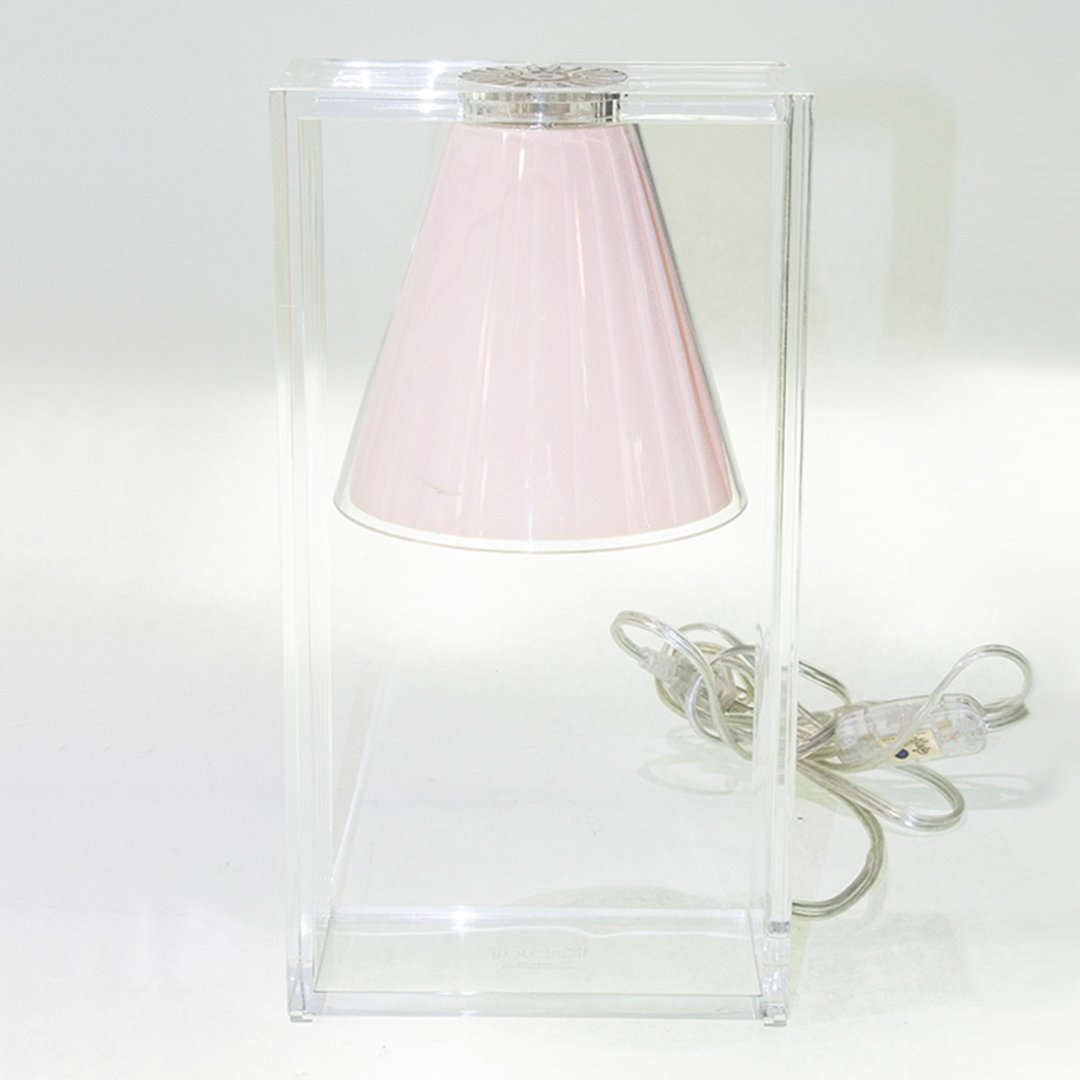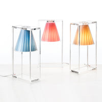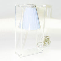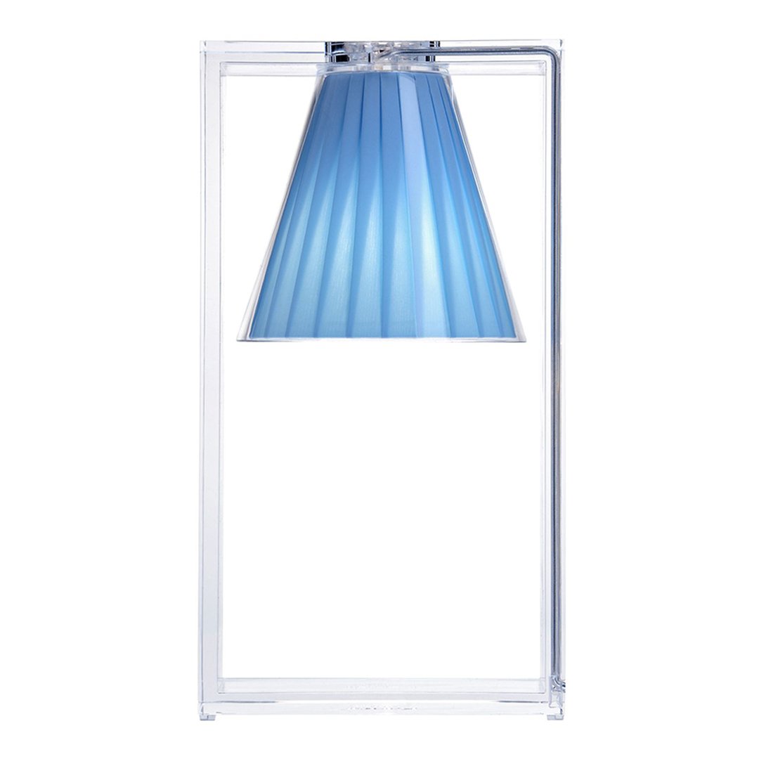 Light Air was created as an illusionist table lamp, a hanging light that defies the laws of gravity. Its structure is a strong graphic statement composed of a rectangular frame formed by two pieces of transparent thermoplastic technopolymer containing a pleated fabric conical shade.