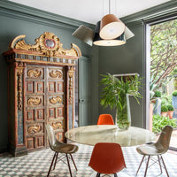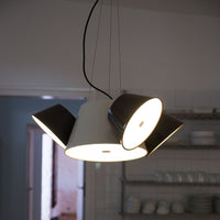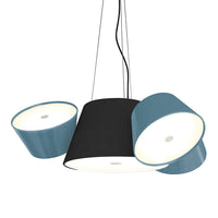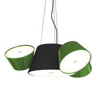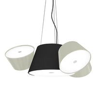 Tam Tam is available as a suspension lamp in two sizes: a regular size with either 3 or 5 satellite shades and a mini size with 3 satellite shades. In all of them, the central shade is available in black or off-white, and the satellite shades can be combined in black, off-white, orange, green, brown, sand and blue.