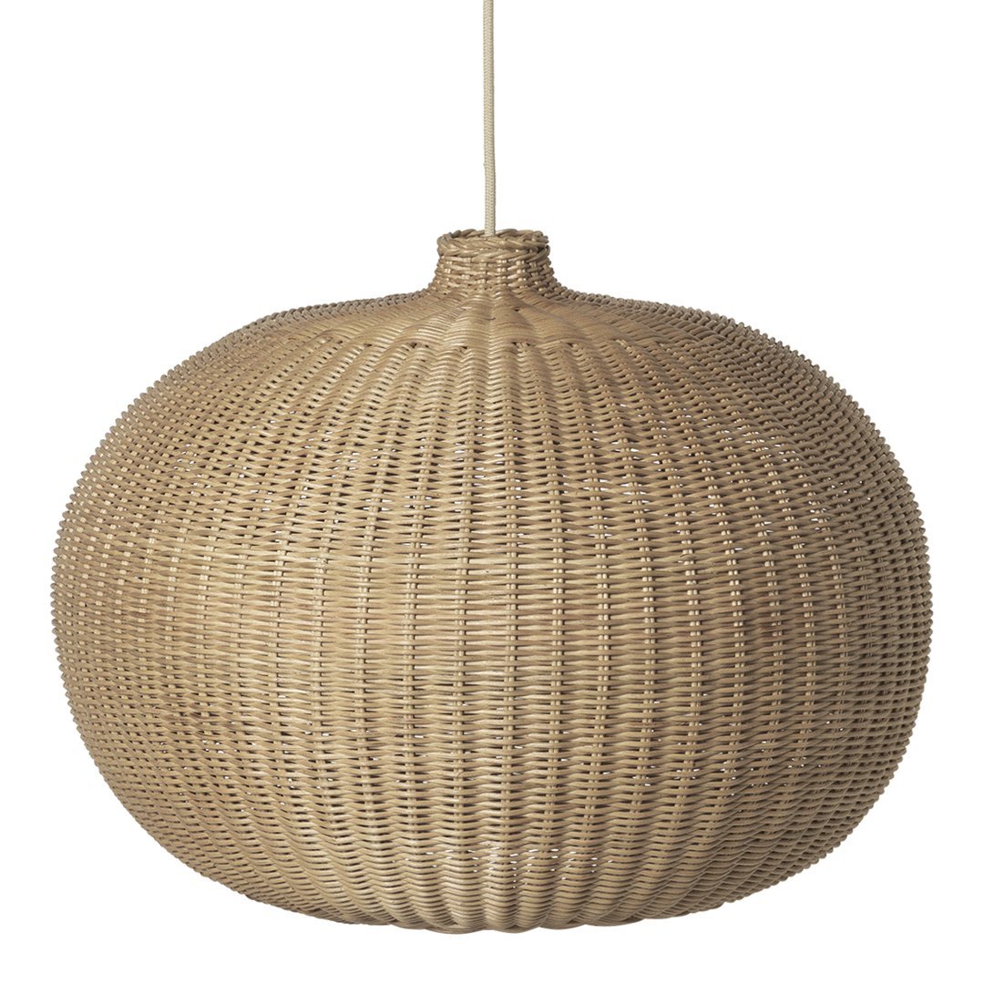 This grand, domed lampshade is braided by hand from rattan and will provide a lovely and natural light source in a room. Regardless whether you hang it from the ceiling above your dinner table or use it as a focal point in a corner, the lamp lets small glimpses of light through its natural shade, while the bottom hole gives a more directed downward light. Cord and canopy not included.