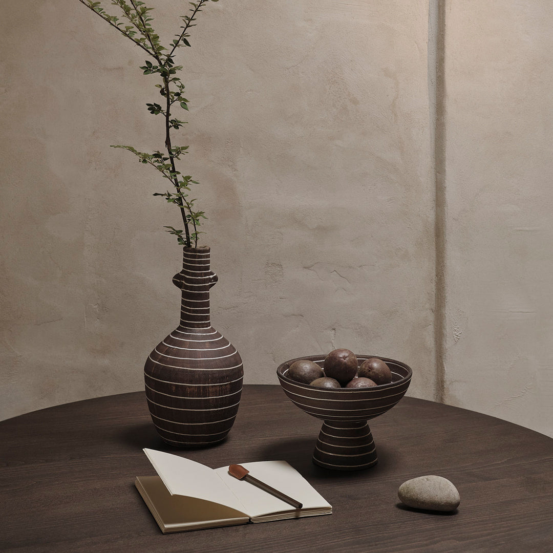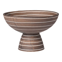 The Brura Bowl offers a warm, tactile expression, making it a captivating centerpiece for any living space. Crafted from terracotta, the piece exudes rustic elegance, enhanced by a coffee-colored glaze that lends a sense of depth and richness. Hand-painted white stripes create a striking contrast, accentuating the bowl's unique shape and enhancing its visual appeal. Whether artfully displayed on a dining table, kitchen counter, or sideboard, the bowl will instantly elevate its contents.