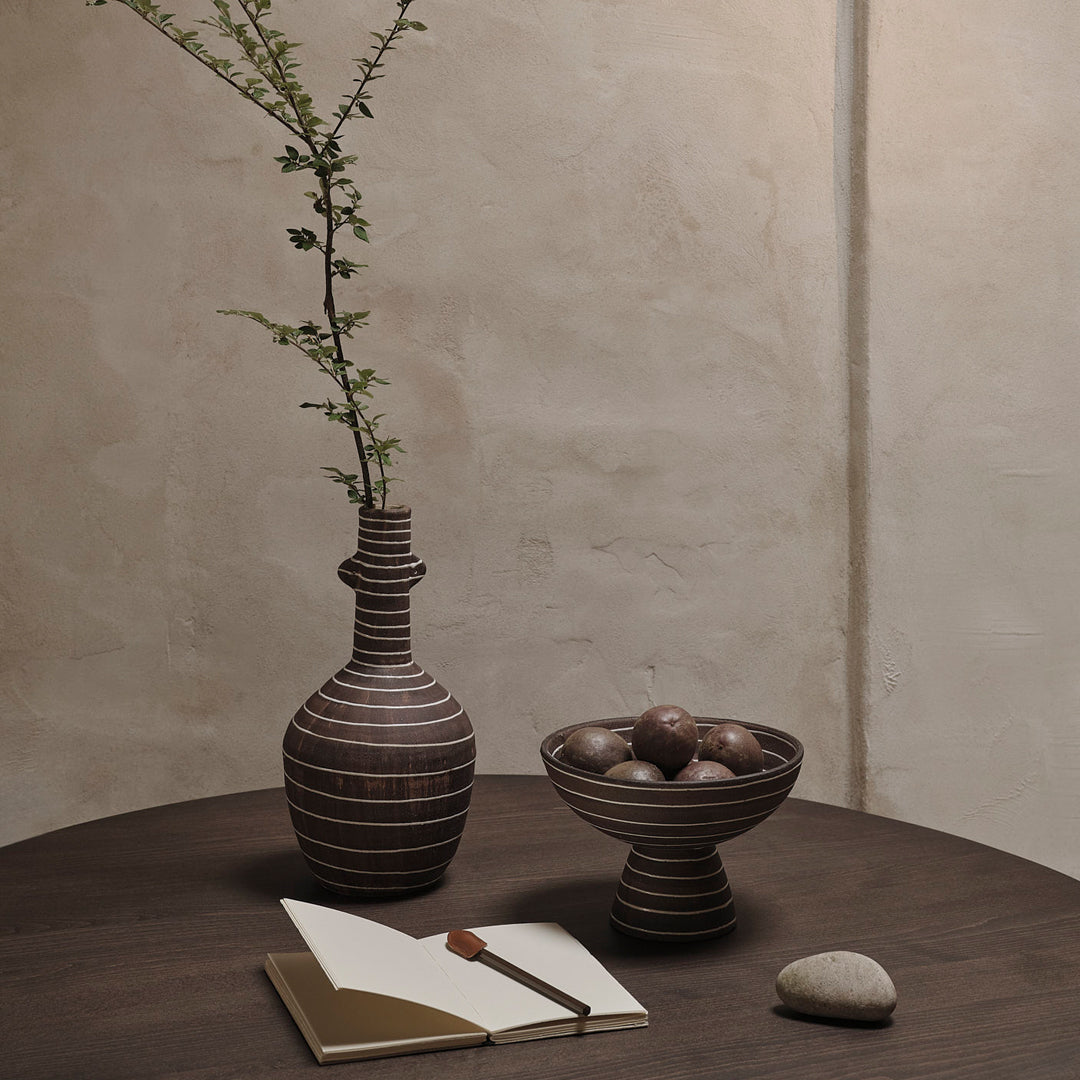 The Brura Vase is defined by its elongated neck and sleek body, adorned with bold white stripes that gracefully snake around its form. Crafted from terracotta, the piece exudes rustic elegance, enhanced by a coffee-colored glaze that lends a sense of depth and richness. Hand-painted stripes accentuate the vase’s contours, while miniature ears on either side add whimsical personality and charm to this distinctive piece. Style it with stalks of fresh flowers or dried branches, or let it stand alone as a striking decorative element.