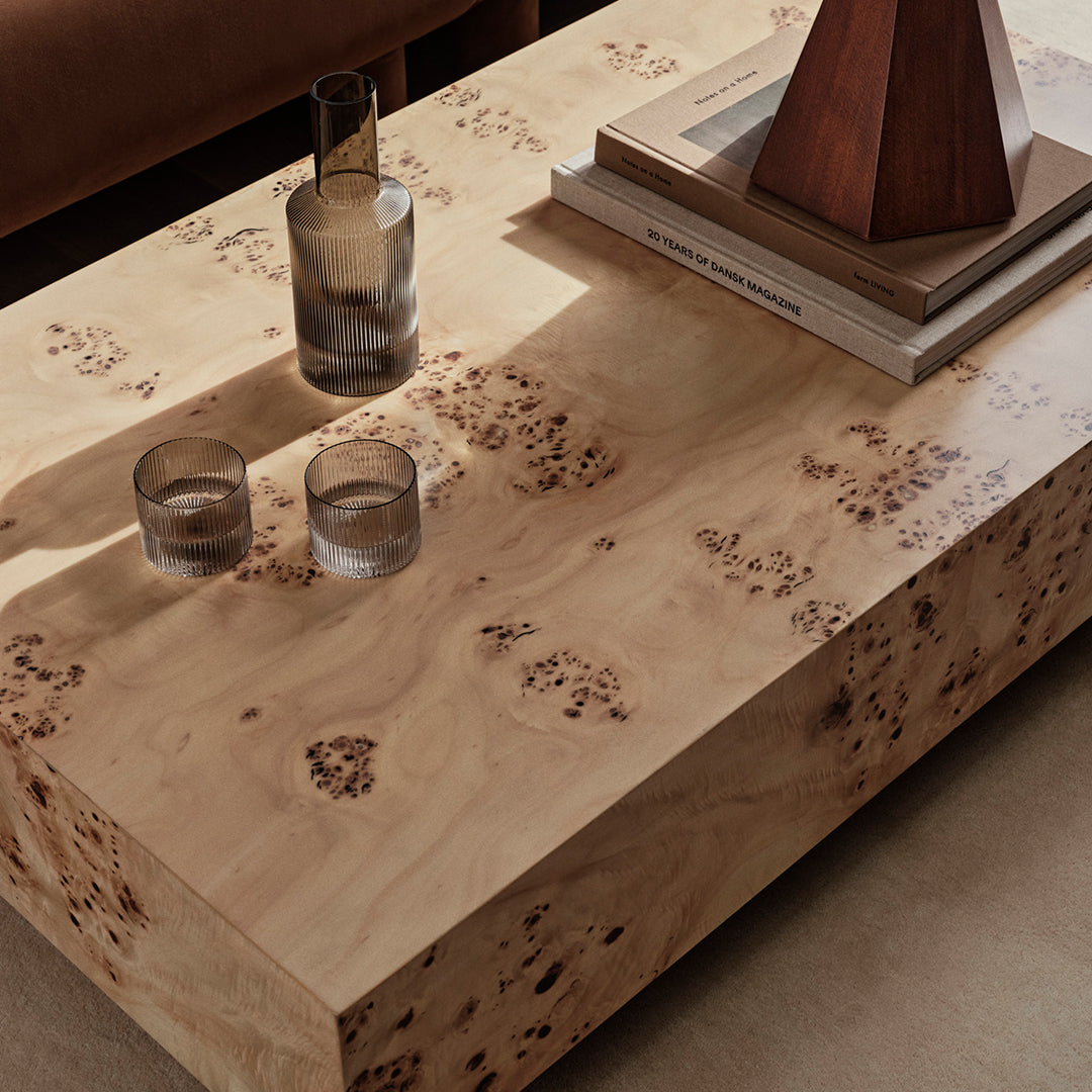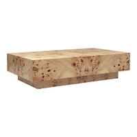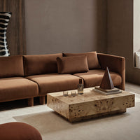 The Burl Coffee Table marries the rich textures of burl wood with the stark, simple lines of brutalist shapes. The product is FSC™ certified, crafted from burl wood veneer and MDF core, and brings a bold yet warm presence to your living space, perfectly balancing robust design with the elegance and warmth of wood patterning.