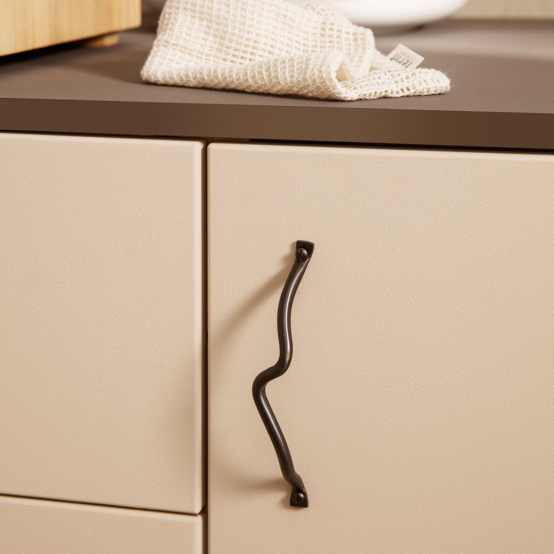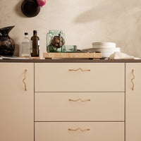 Curvature is a series of organically shaped accessories for the home that have been hand formed in pure, solid brass with a matte finish. The whimsical curves juxtapose the solidity of the material, and make a feminine, functional addition to any bedroom, bathroom, hallway or kitchen. The Curvature Handle will add a decorative, unique touch to any cupboard, cabinet or drawer. Crafted by hand, no two handles are 100% identical.
