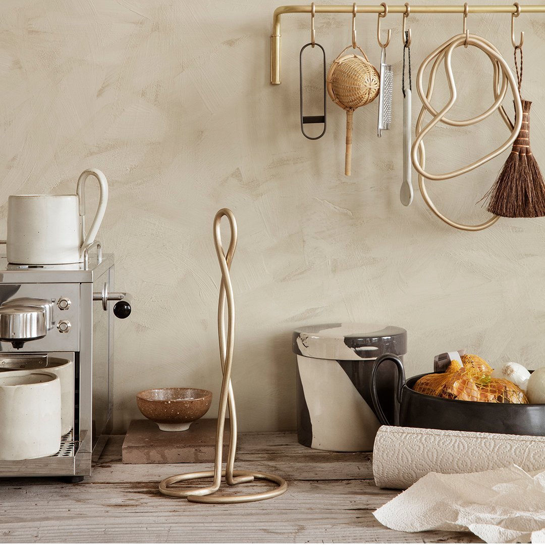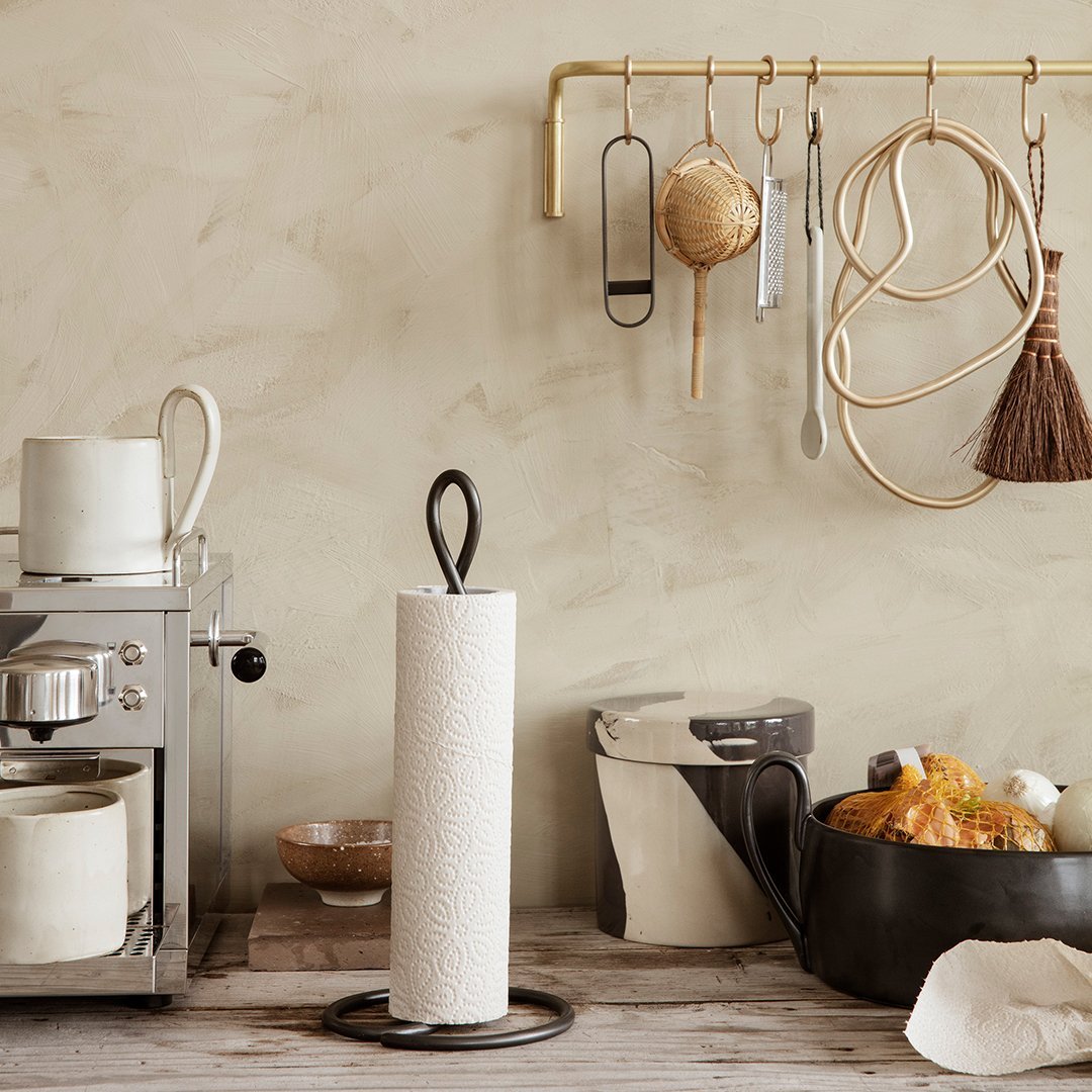 The Curvature family is a series of organically shaped accessories for the home that have been hand formed in solid brass with a matte finish. The whims+D47ical curves juxtapose the solidity of the material and make a functional addition to the kitchen. With its sculptural expression, the Curvature Paper Towel Holder works as a decorative storage solution for your paper towels and can easily be displayed on your kitchen counter. Crafted by hand, no two pieces are identical.