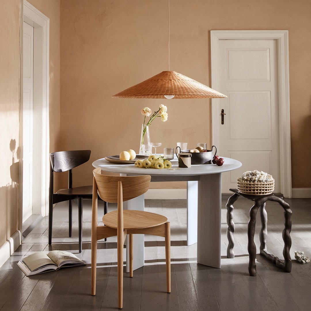 Hand-braided from natural rattan, our Dou series celebrates the lovely contrast between geometric shapes and the organic, textural qualities of the material. This lampshade will provide bright overhead lighting while also letting small glimpses of illumination through the shade itself