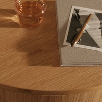 The Olles Storage Table combines form and function, skillfully crafted with FSC-certified solid oak legs and oak veneer. Its clean, rounded geometry and four sturdy legs provide stability while lending the piece a sense of effortless lightness. Designed with a pivoting top that opens smoothly, it reveals ample storage space, perfect for organising living room essentials, textiles, and treasured knick-knacks.
