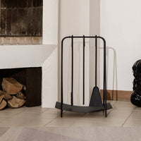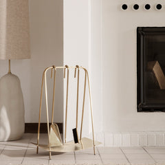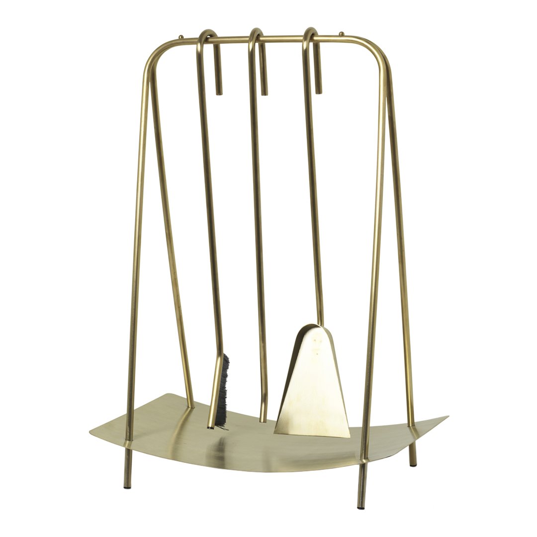 Inspired by jewellery, this set of tools brings out the best of your fireplace. With organic shapes and delicate lines, the powder coated steel ensemble helps you tend to the fire in style. Merging functionality and aesthetics the set lightens up the area around your hearth or fireplace. The set includes a stoker, spade, a broom, and the stand. Available in black and brass.