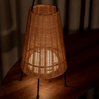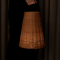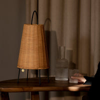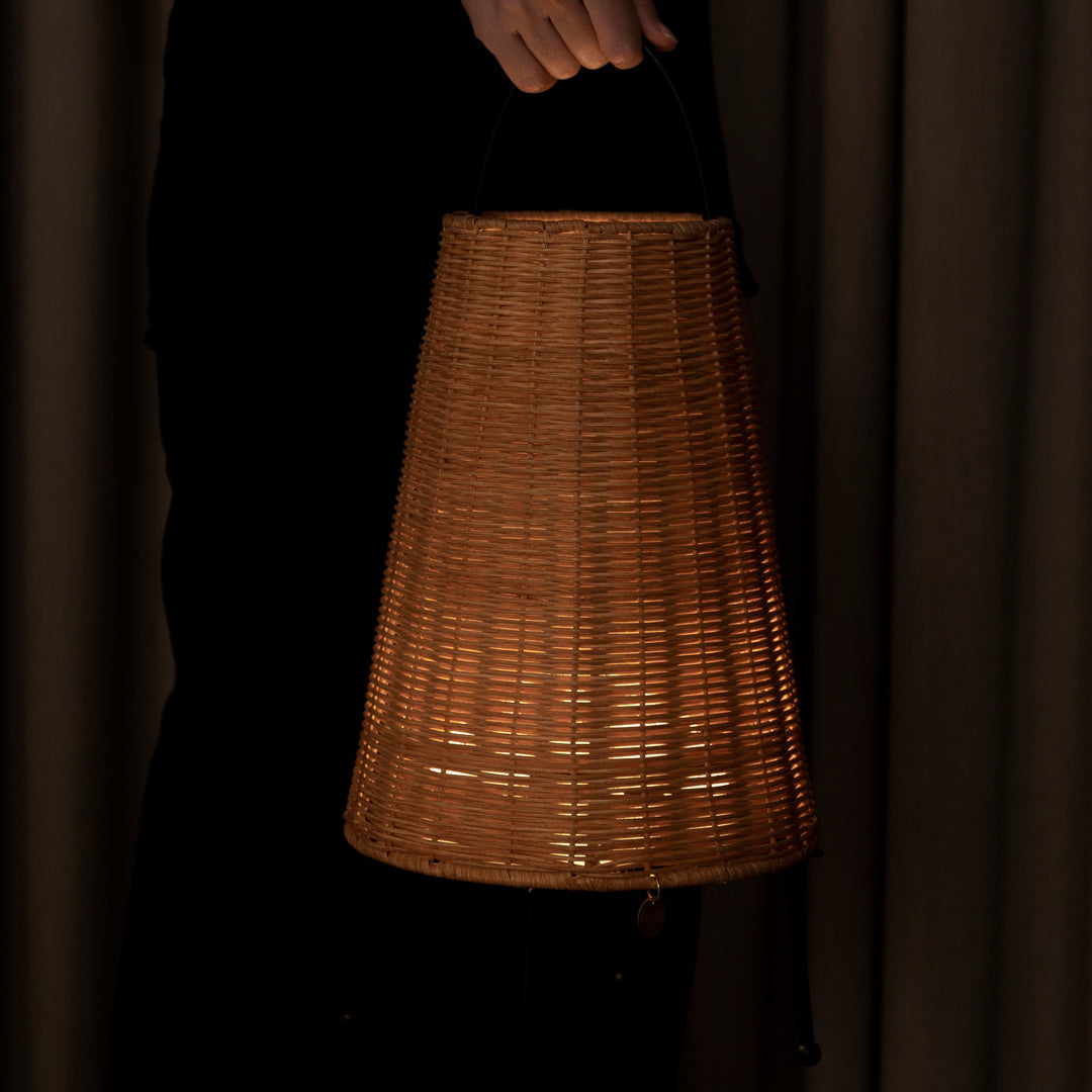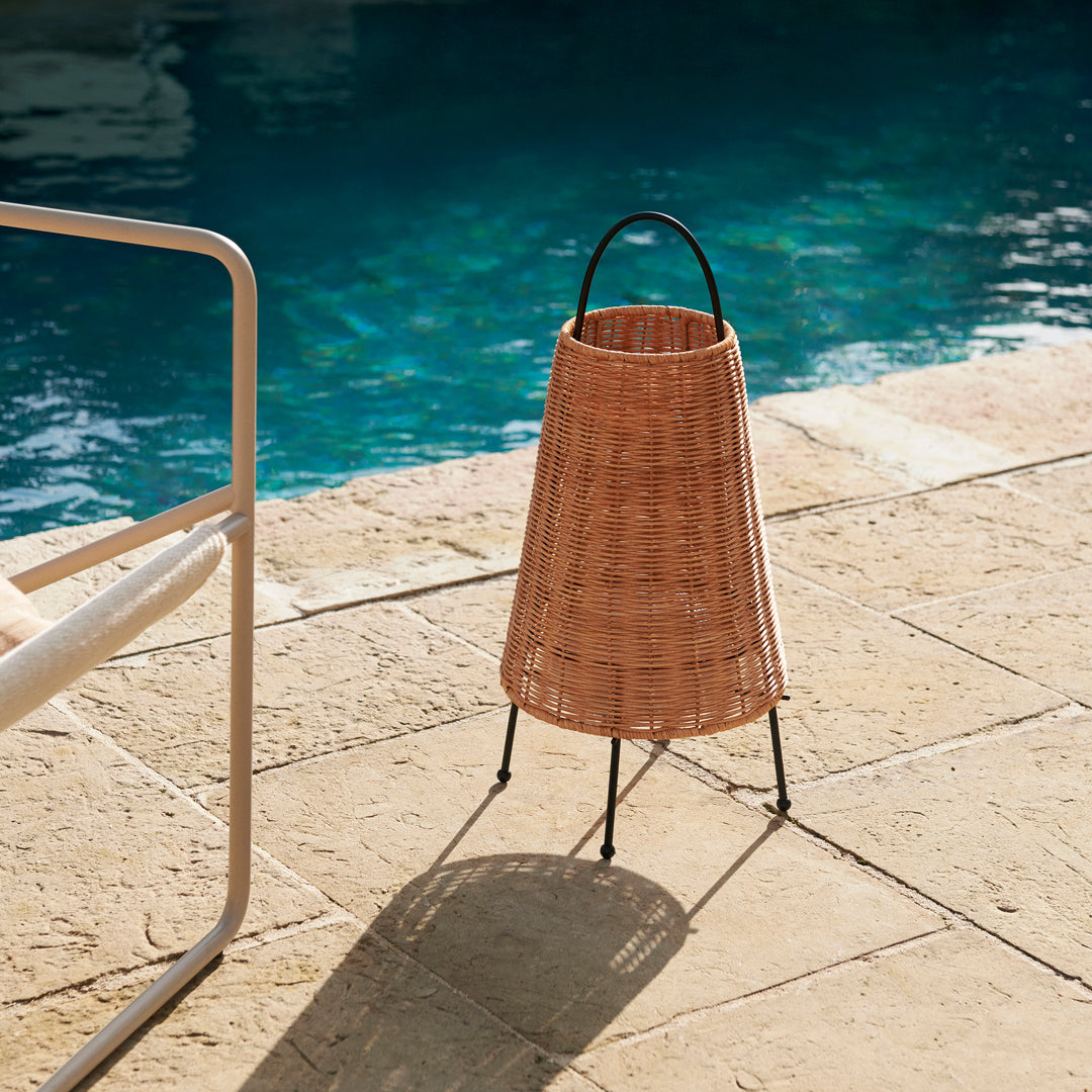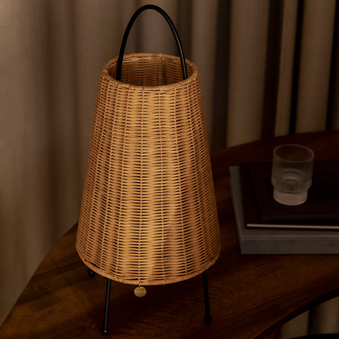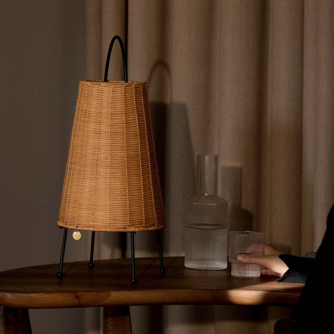 Reinterpreting the form and function of a lantern, the Porti Braided Lamp is a versatile and portable lamp that can be used in a multitude of settings. Emitting a soft and warm light, the lamp features a braided rattan shade that rests on a slender metal frame, resulting in a charming mix of tactility and sleekness. The lamp base features a hover touch function that enables you to control the light intensity as well as turn the lamp on and off with just a gentle touch or tap, and adjustable feet that help you to align the lamp on uneven surfaces.