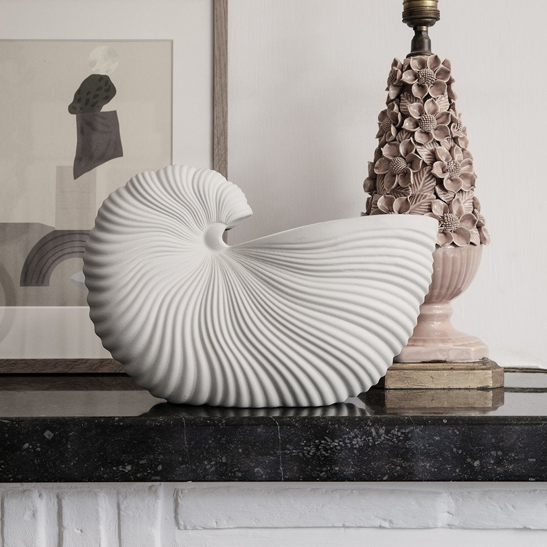 Filled with your favorite flowers or by its own, this pot shaped like a nautilus shell merges natural shapes with contemporary design. With a matte outside and glazed inside, it adds delicate detail to any room, simple and sculptural all at once.