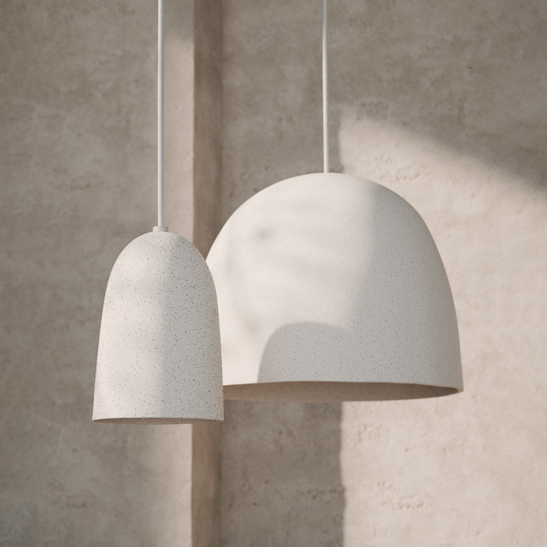 Made with a distinct stoneware that features a grainy, raw texture, the Speckle Pendant is a ceramic ceiling lamp with a natural look and feel. Crafted by hand, the lamp has a fluid, organic silhouette. The matching ceramic canopy unites the lamp’s unique expression.