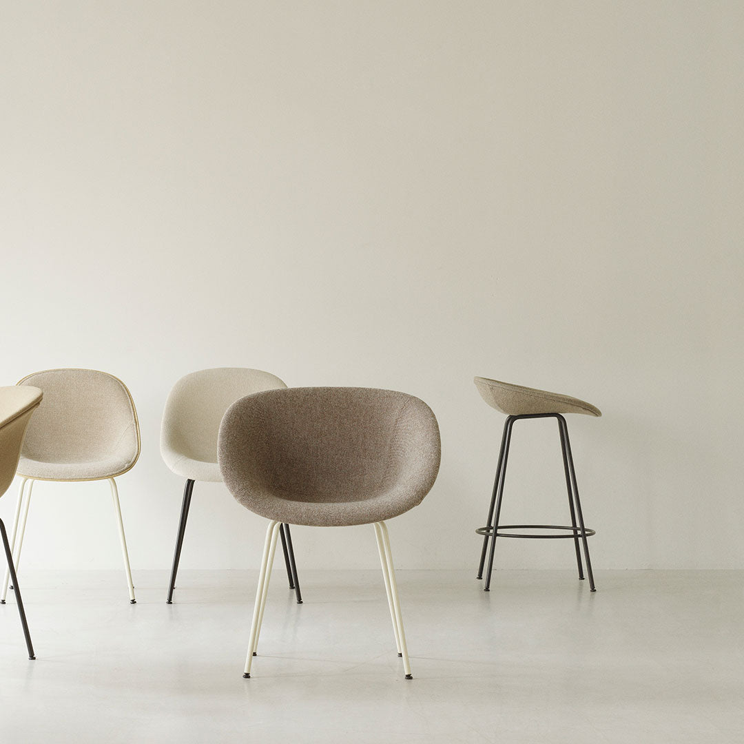 Mat Chair collection includes a dining chair with two shell typologies, a barstool in two heights, a bar chair in two heights and a bar armchair in two heights, all available with a hemp shell or a hemp shell with added eelgrass, as well as with front or full upholstery.