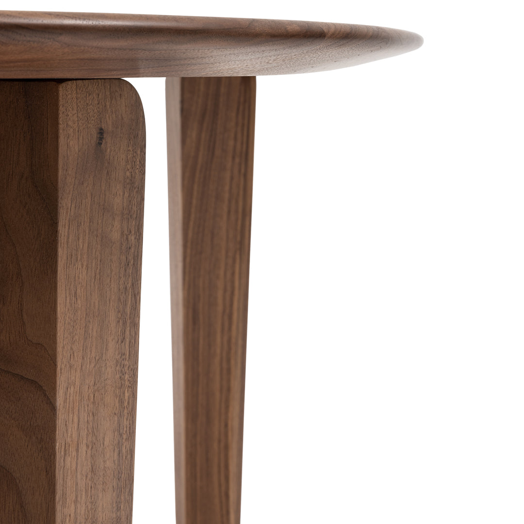 The cut diamonds of solid wood appear sculpturally powerful and at the same time seem to float. You can choose from three tabletop shapes: Circle, rectangle and convex.