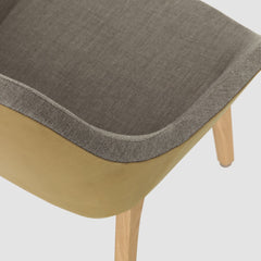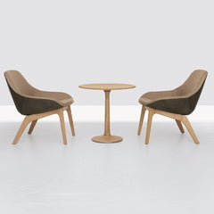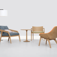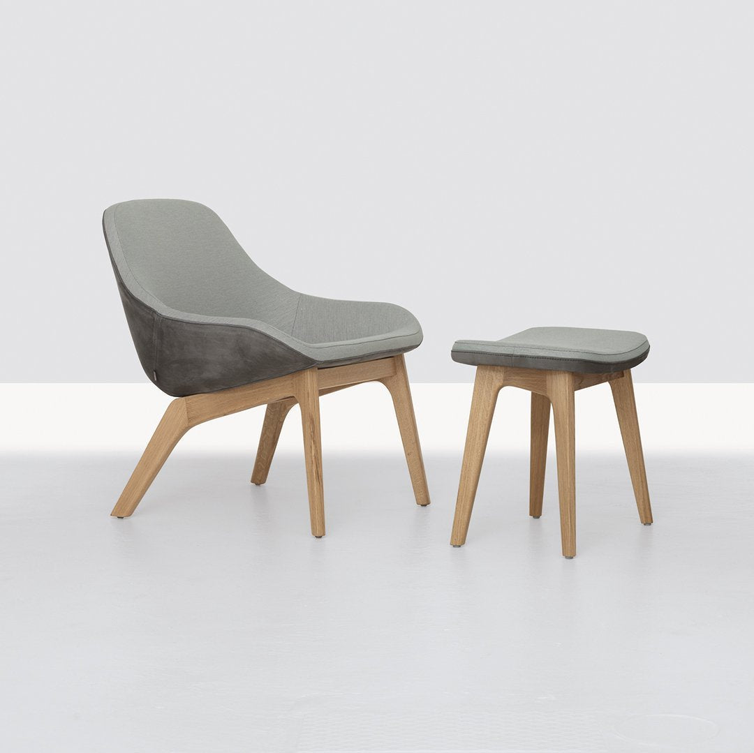 MORPH LOUNGE brings together an unusual combination of materials: The solid wood frame carries a comfortable upholstered shell. The positioning of the legs gives the chair a unique posture, as if it had a support and a free leg. The softly formed seat invites to take a seat.