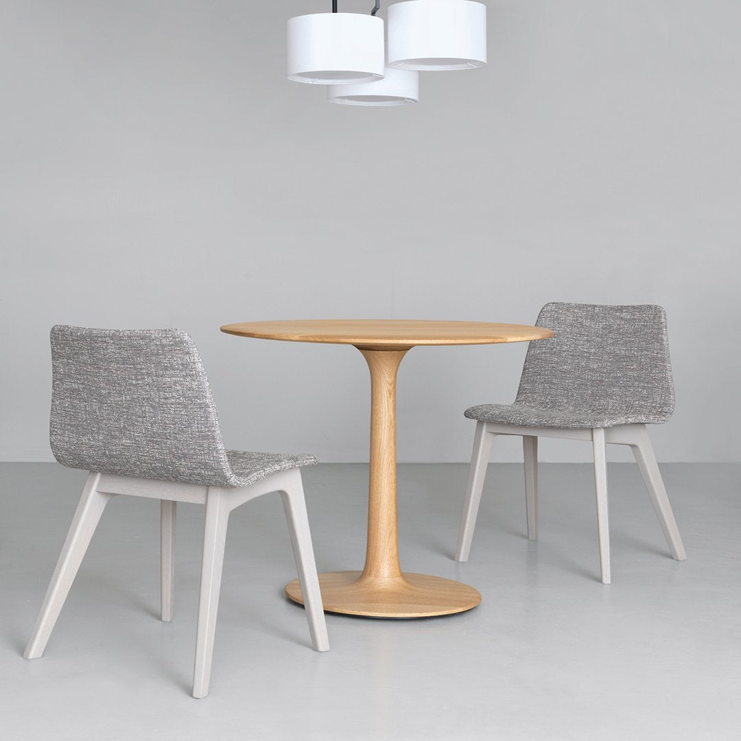 The sculpturally formed sub-frame conveys the interplay between stability and dynamism. The solid wood frame carries a light molded veneered wood shell, optionally with padded seat, or a fully upholstered shell.