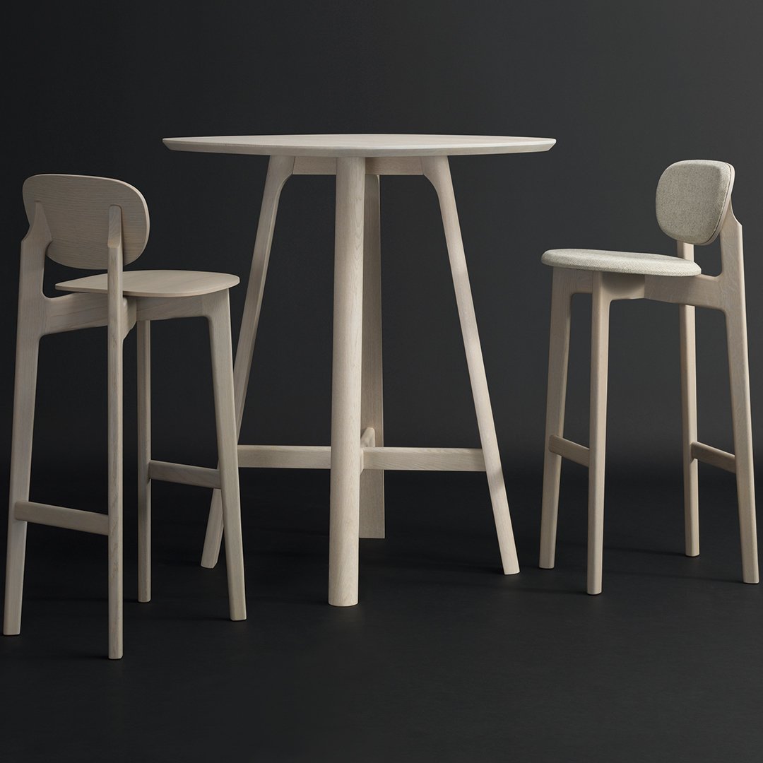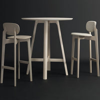 The shells consisting of moulded wood appear light and inviting. ZENSO BAR is available either with a wooden seat and back shell, with an upholstered seat and back shell or with an upholstered seat and wooden back shell.ZENSO BAR is available in seat heights of either 65 or 80 cm, each with a footrest.