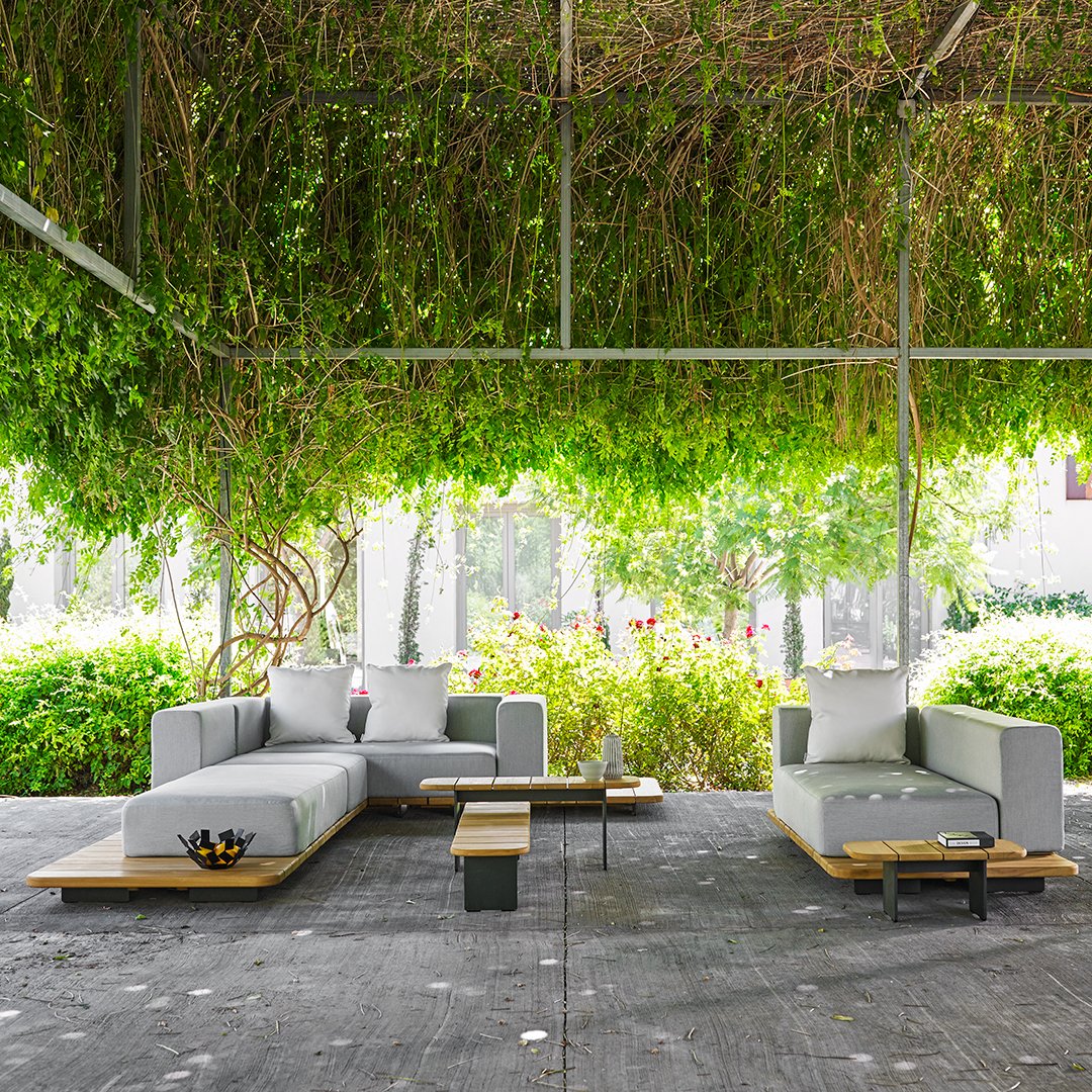 Pal is pure nature, the charm of wood just a few away from Mother Earth. A modular system made with solid teak wood planks that offers endless possibilities when it comes to setting up outdoor relaxation spaces. Sofas and tables in harmony with nature, and upholstery in a variety of colors that includes the serenity of green.