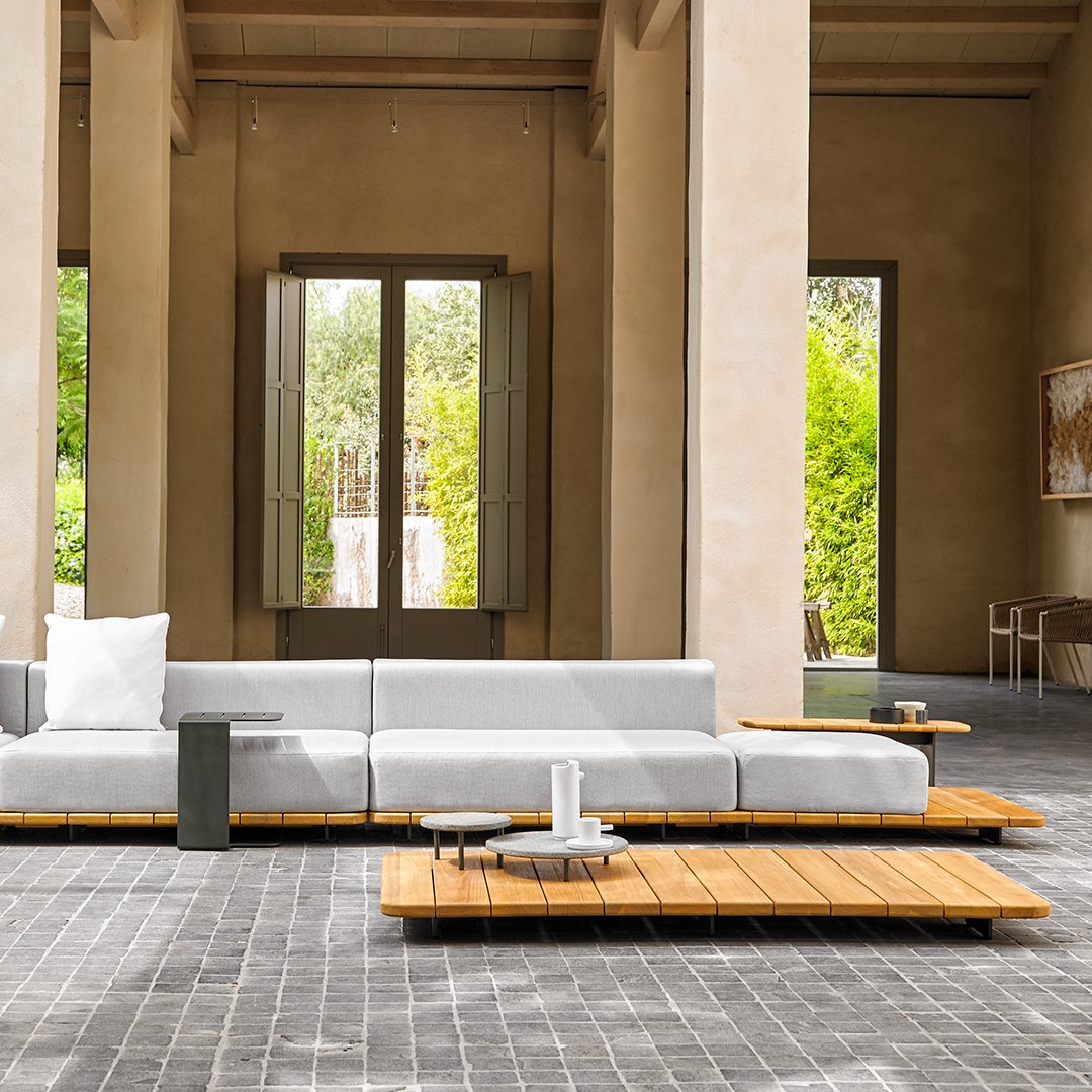 Pal is pure nature, the cosy charm of wood just a few centimeters away from Mother Earth. A modular system made with solid teak wood planks that offers endless possibilities when it comes to setting up outdoor relaxation spaces. Sofas and tables in harmony with nature, and upholstery in a variety of colors that includes the serenity of green.