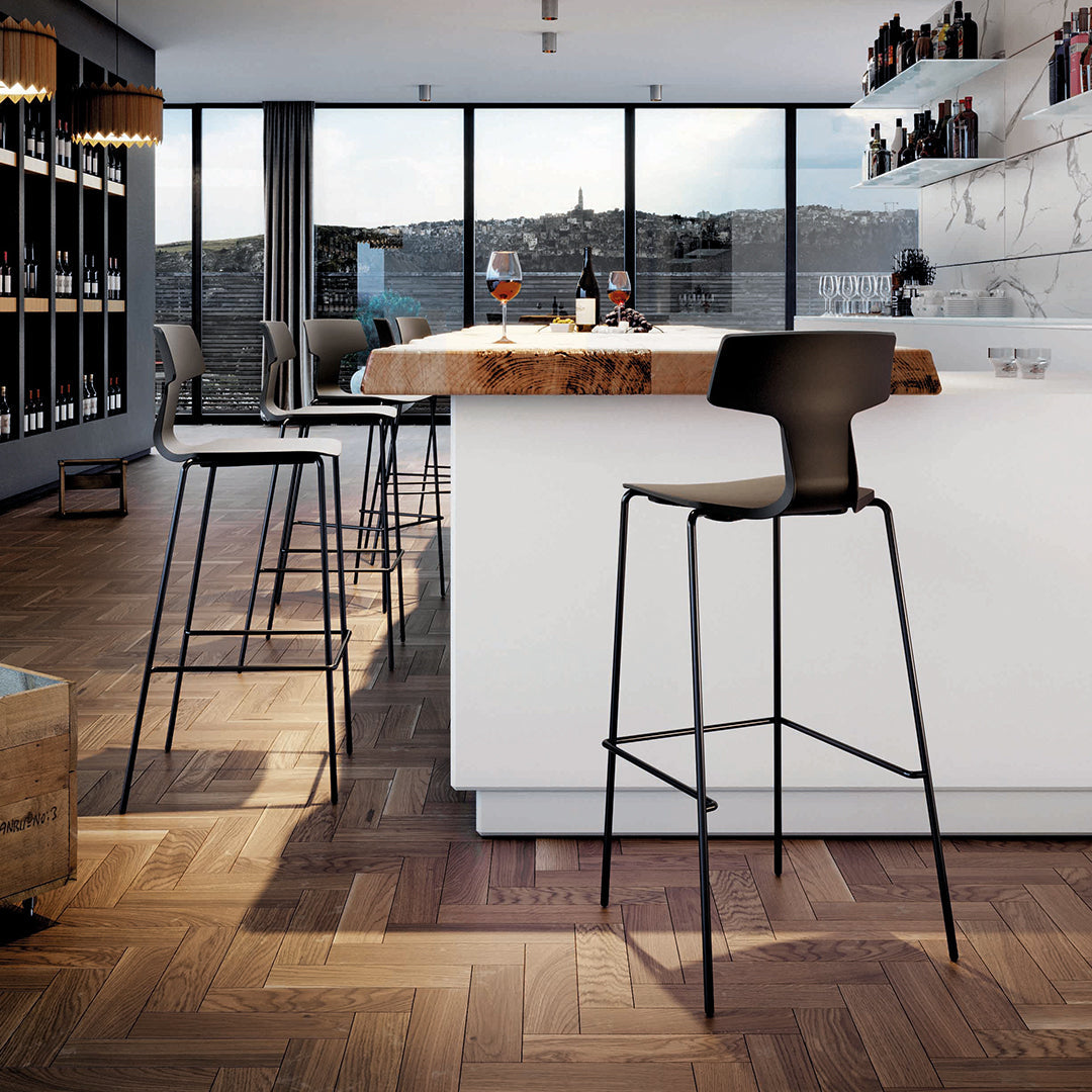 The SPLIT 3 barstools, available in two versions with seat height of 75 and 65 cm, complete the family, The shell of the original version is downsized to fit at best the proportions oft he higher frame.