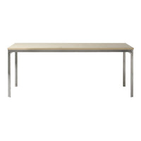The PK55 Table was designed by Poul Kjaerholm in 1957 and features an ash table top with a veneer finish and a satin brushed stainless steel brush. For a larger version, see the PK51 Table.