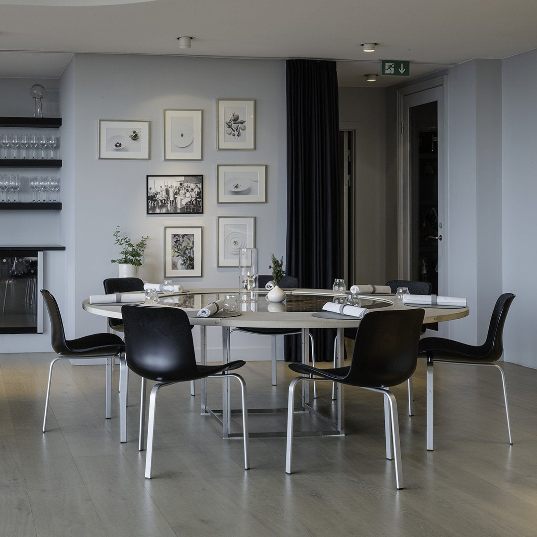 Danish Design Store offers all variations of the PK8 Chair. It is available with front upholstery in black or white moulded plastic in a limited range of fabrics or leathers. The base is made of anodized, satin brushed aluminium and the shell of PC/ABS plastic.