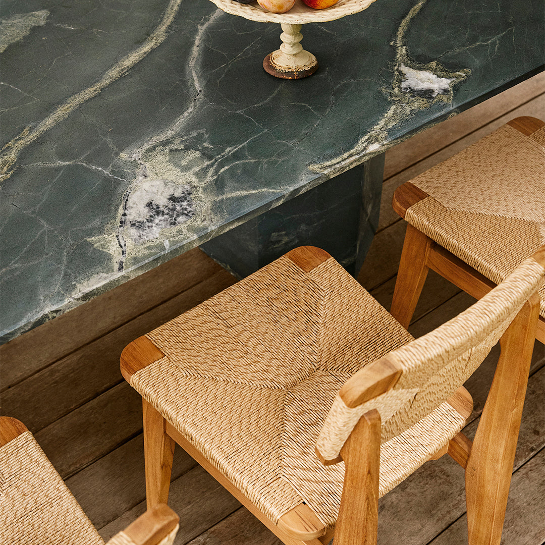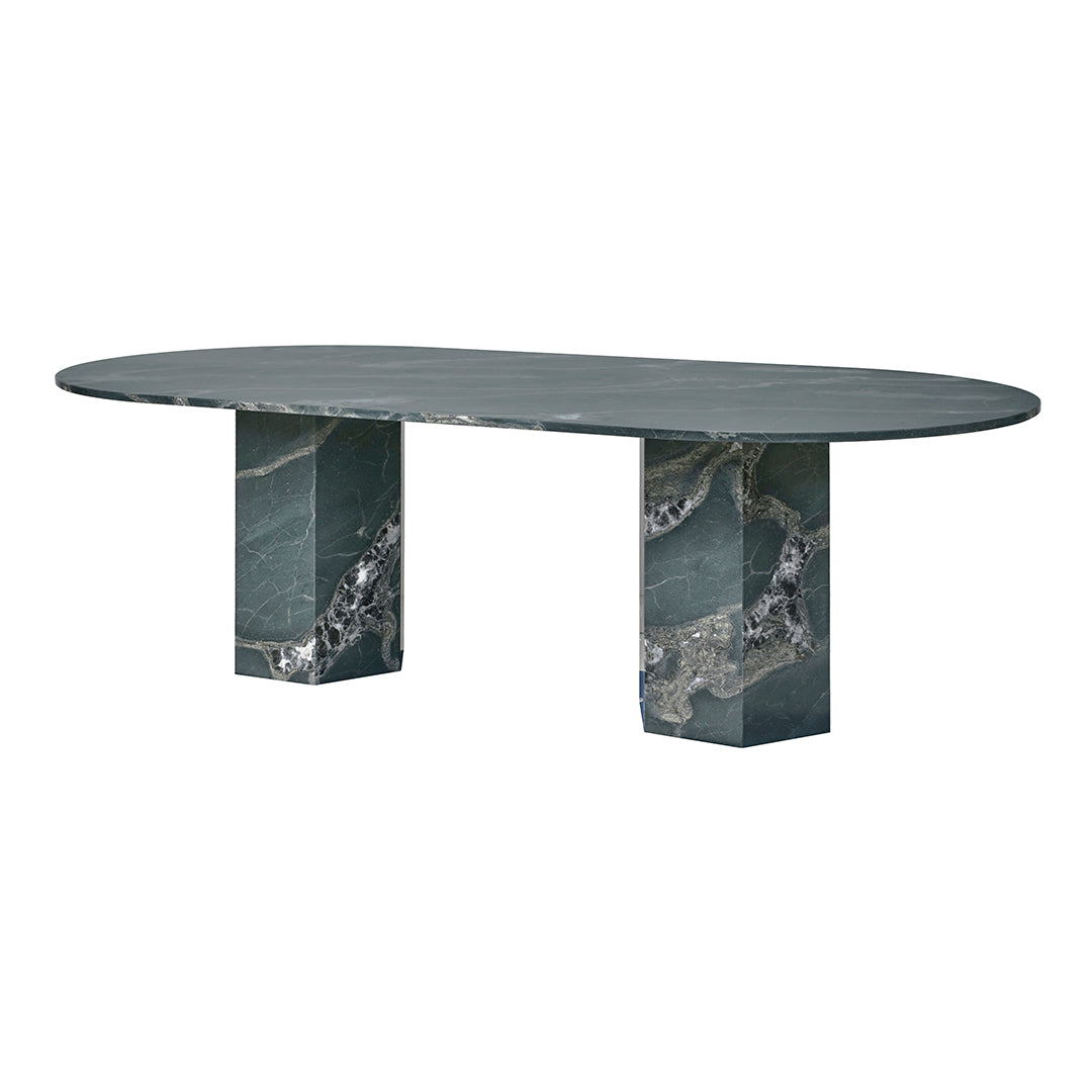 GUBI’s introduction of GamFratesi’s Epic Tables brought the aesthetics of Classical architecture and the rich textures of natural stone into the home. Now, the much-loved design steps outside with a new edition specially optimized for outdoor use. Designed and named in homage to the architectural traditions of ancient Greece and Rome, the tables of the Epic Collection are characterized by their monolithic silhouettes and materiality. Where the interior iterations are crafted from travertine or steel, the Epic Outdoor Table takes a new material direction, exploring the mesmerizing visual expression and impressive durability of quartzite.