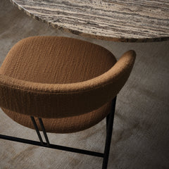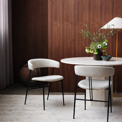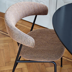 Available as a fully upholstered version, and as a version with an upholstered seat and an oiled oak or walnut backrest, the Violin Chair can be dialed up or down with different upholstery options.