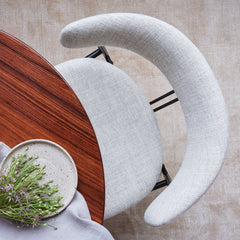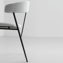 The elegantly tapered legs of the powder-coated steel frame support a generous rounded seat and an embracing backrest that extends to partially support the forearm, elbow, or hands as an occasional armrest. This dual functionality makes the Violin Chair the perfect hybrid of dining chair and armchair. It allows you to easily twist around to speak to the person sitting next to you at dinner, while still remaining comfortable long after dessert and coffee are served.