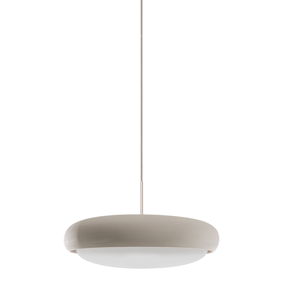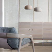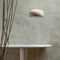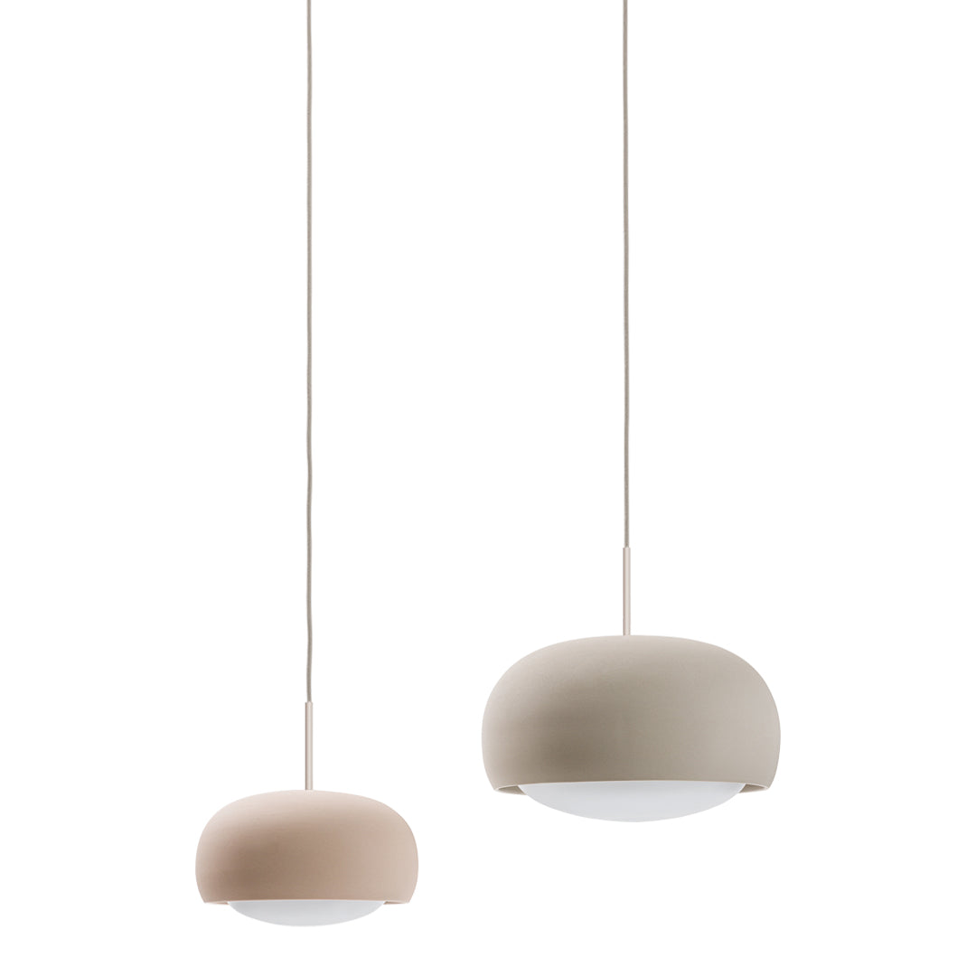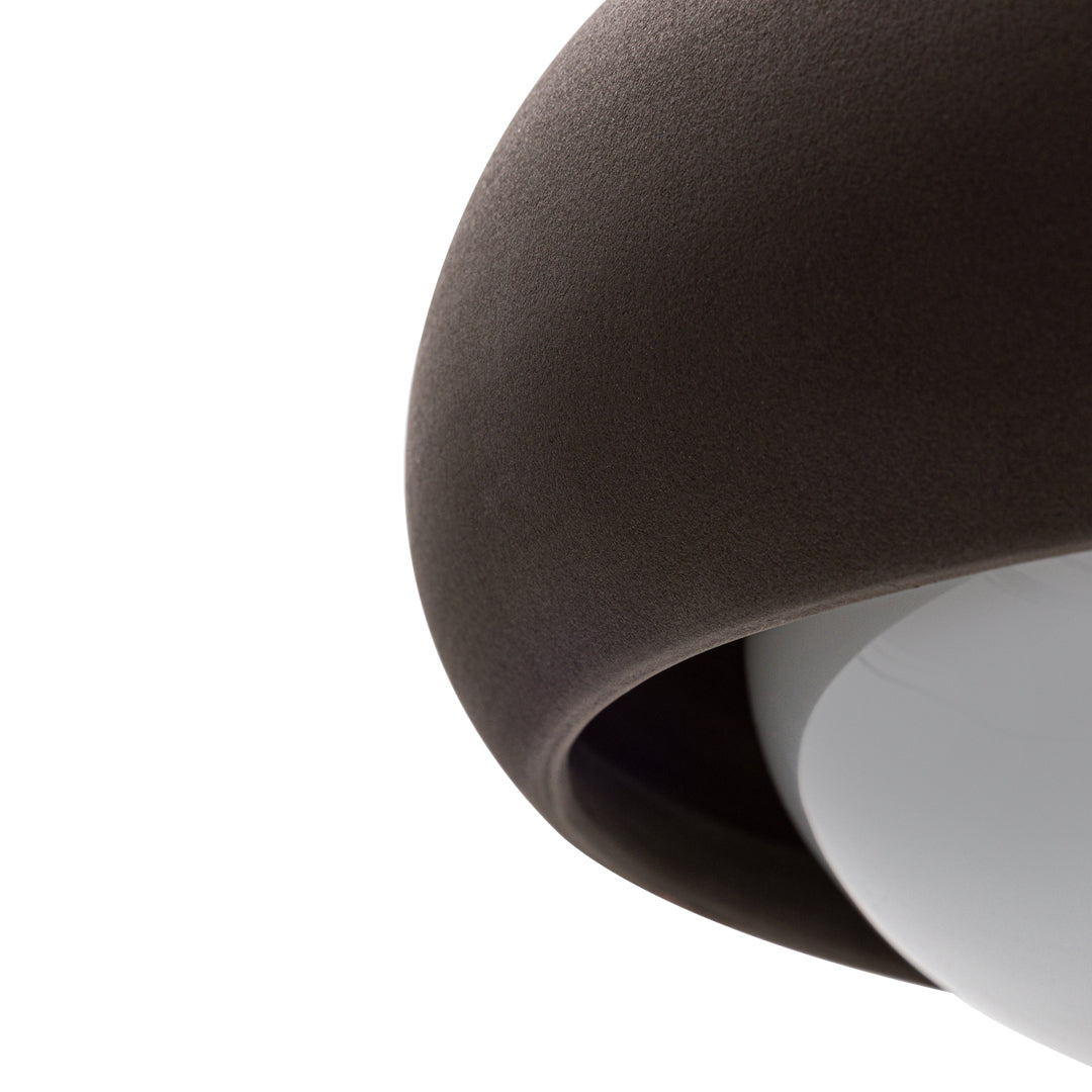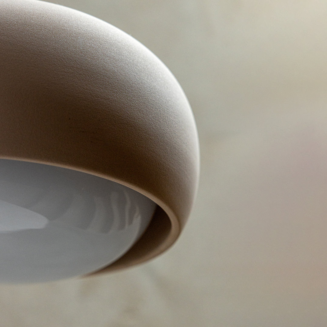 Engobe is a homage to the natural properties of clay. The ceramic lampshade encloses the white coloured glass body. This is mouth-blown and bathes the surroundings in soft light.